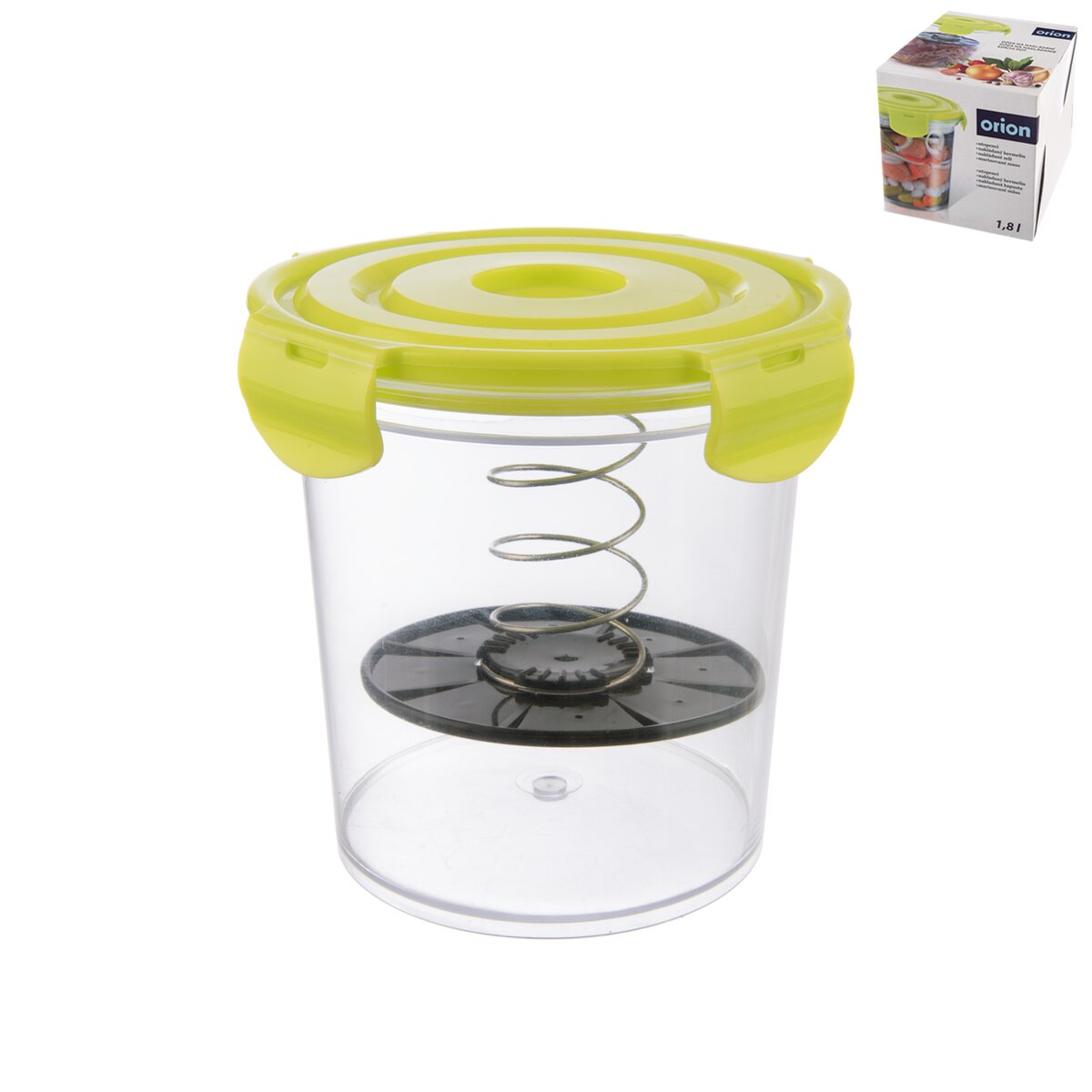 Kód produktu 124651Plastová transparentní dóza o objemu 1,8 l na marinování a nakládání potravin. Součástí je i pružinové víčko opatřené 4 pevnými klipy, které udrží potraviny ponořené v láku nebo oleji.