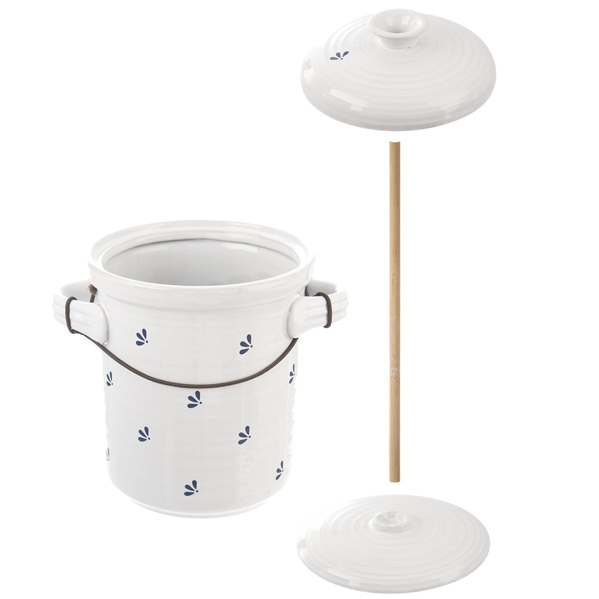 Kód produktu 127604Keramický hrnec MODROBÍLÁ o objemu 2,8 l je opatřen poklicí, gumičkou, dřevěnou tyčkou a vnitřním těžítkem. Je určen k přípravě výborné nakládané zeleniny, tzv. pickles.