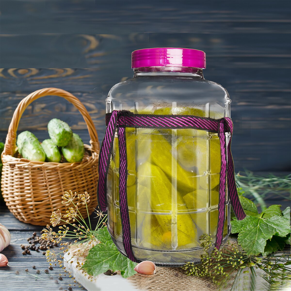 Skleněná dóza s plastovým víkem na závit a se dvěma uzávěry - jeden dózu pevně uzavře a dóza uchová a bezpečně přepraví tekutiny, druhý je opatřen otvory a po zalití žlábku ve víku vodou zajišťuje proces kvašení. Díky tomu v něm můžete připravit kvašené okurky, víno, zelí. Nahradí klasické demižony a hrnce na kvašení. Materiál: sklo, plast. Je opatřen popruhy pro pohodlné přemisťování. Rozměry: objem 9 l, pr. 22 cm, v. 31 cm.