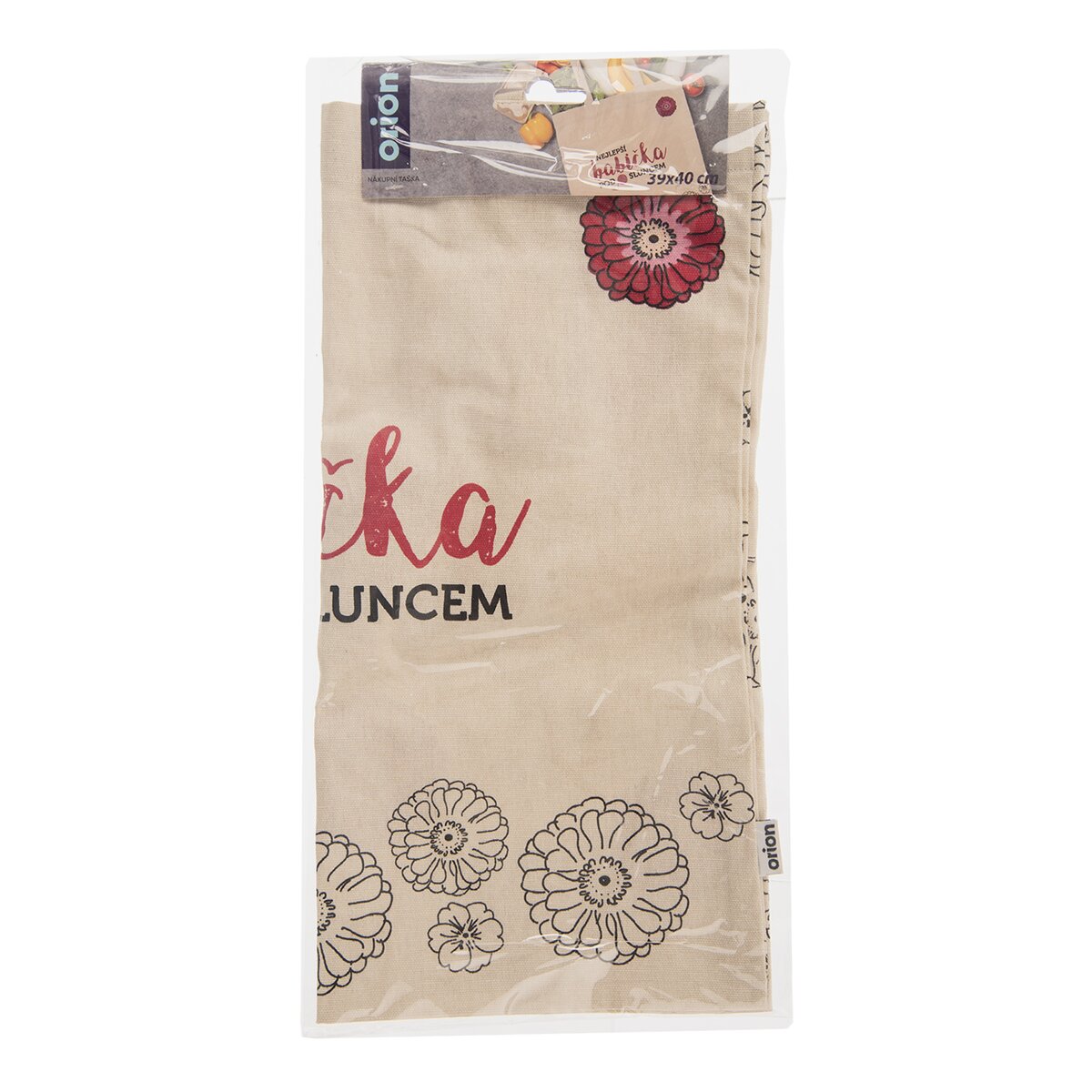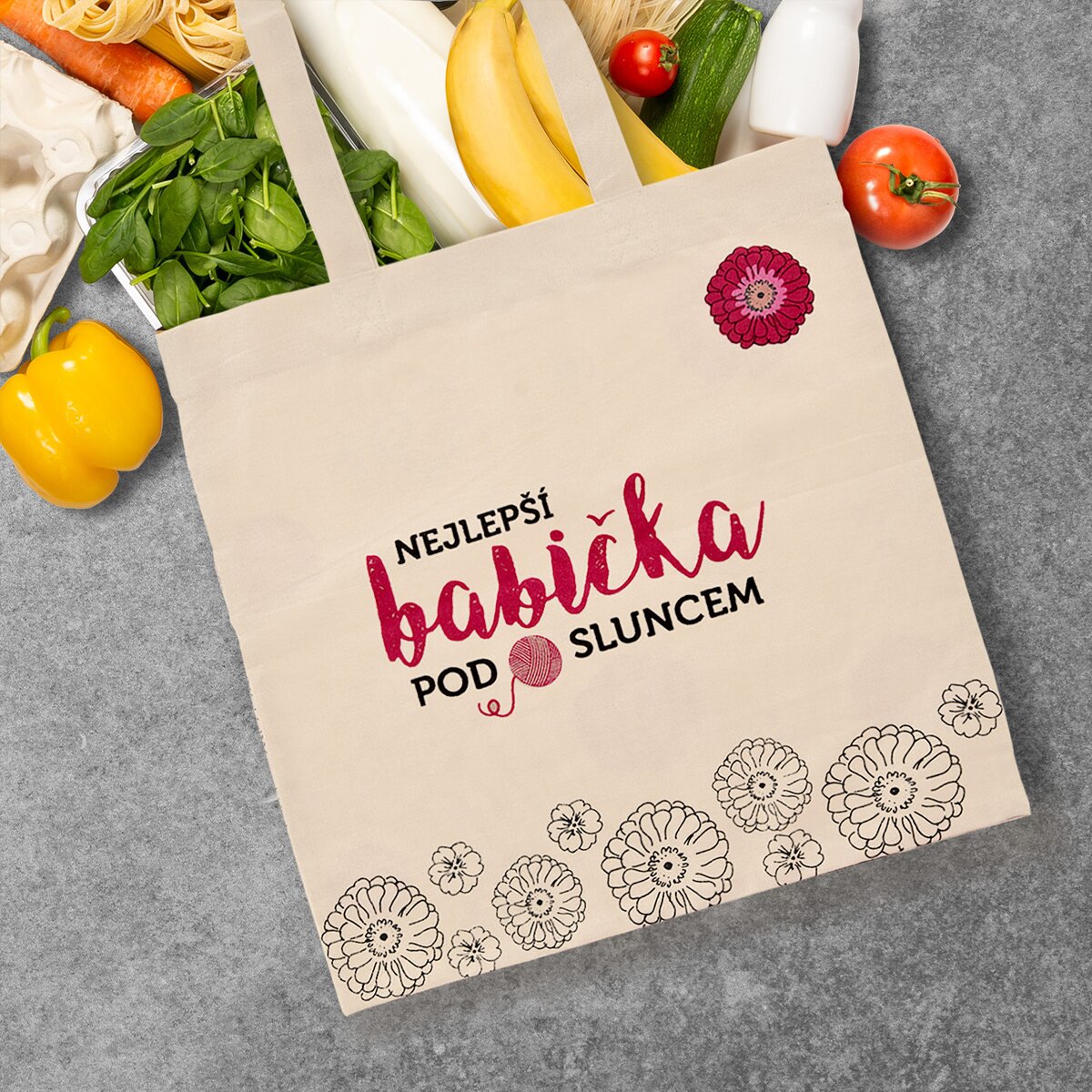 Kód produktu 731419Bavlněná nákupní taška o rozměrech 39×40 cm, s květinovým motivem a nápisem NEJLEPŠÍ BABIČKA POD SLUNCEM.