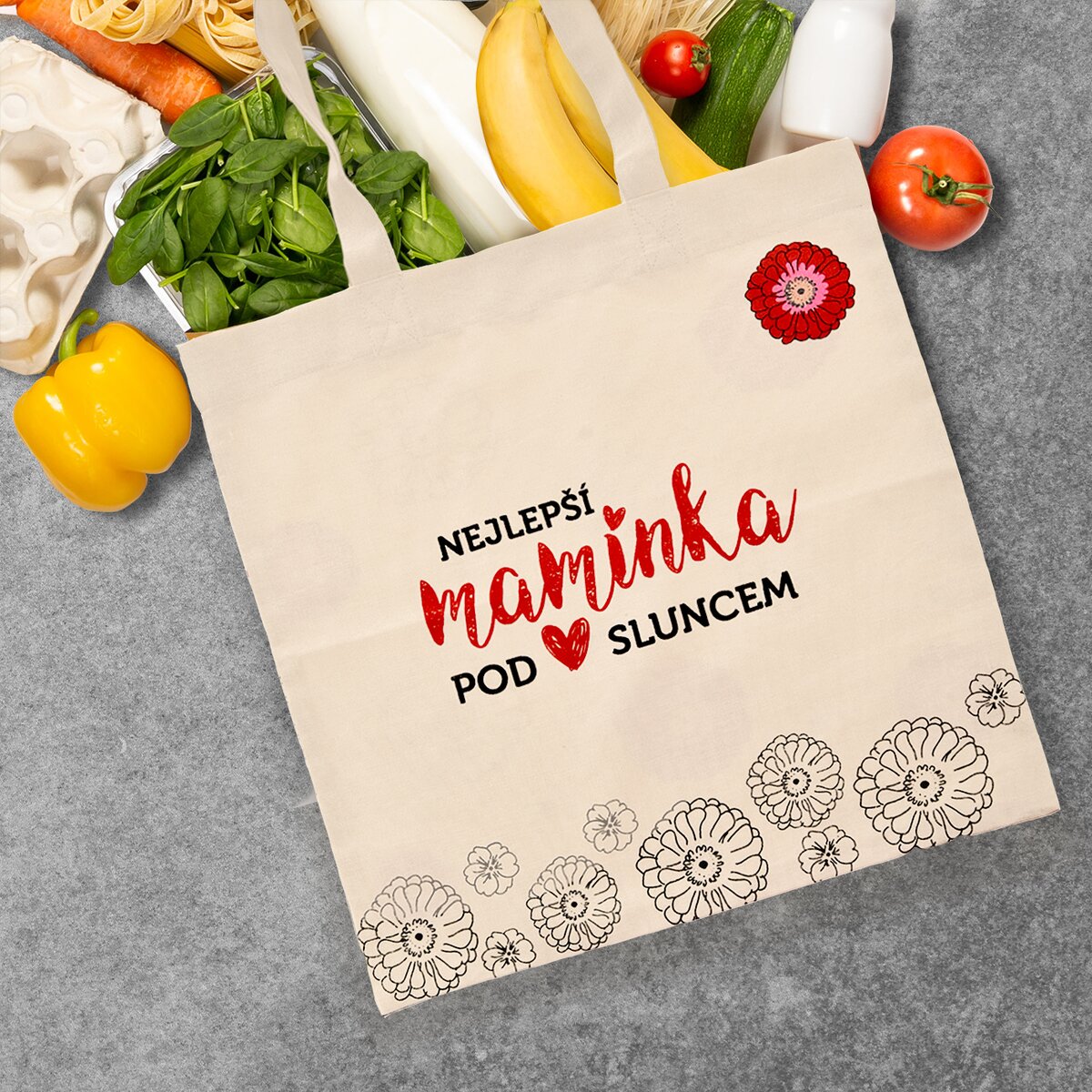 Kód produktu 731420Bavlněná nákupní taška o rozměrech 39×40 cm, s květinovým motivem a nápisem NEJLEPŠÍ MAMINKA NA SVĚTĚ.