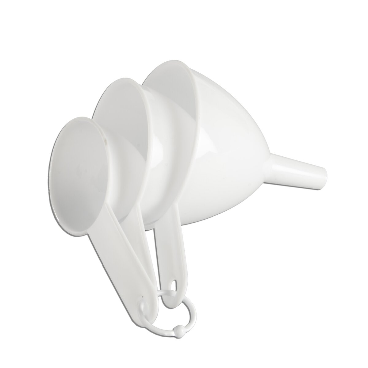 Kód produktu 120431Sada 3 kusů plastových nálevek průměru 6,5, 8,5 a 9,5 cm pro přesnější nalévání různých tekutin, sirupů, šťáv, oleje, čaje, ale i láku při zavařování.