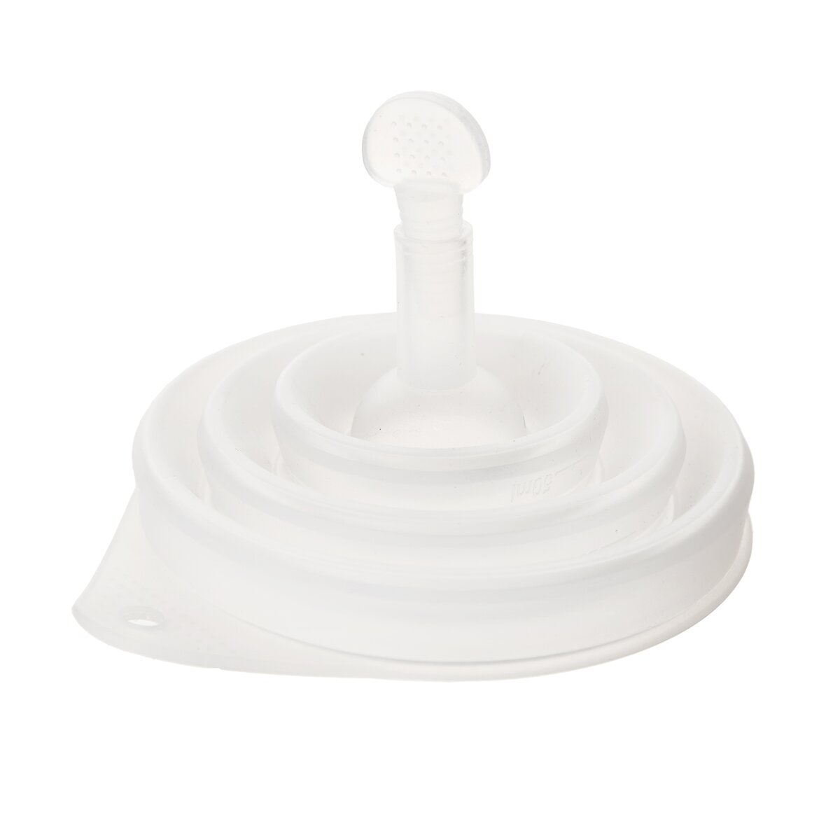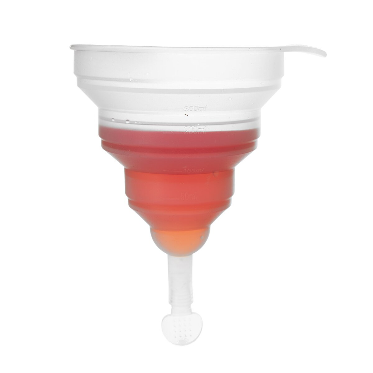 Kód produktu 120454Skládací silikonová nálevka je vhodná k nalévání různých tekutin, ale díky vyznačené stupnici po utěsnění dolního otvoru přiloženým špuntem ji lze použít jako odměrku.