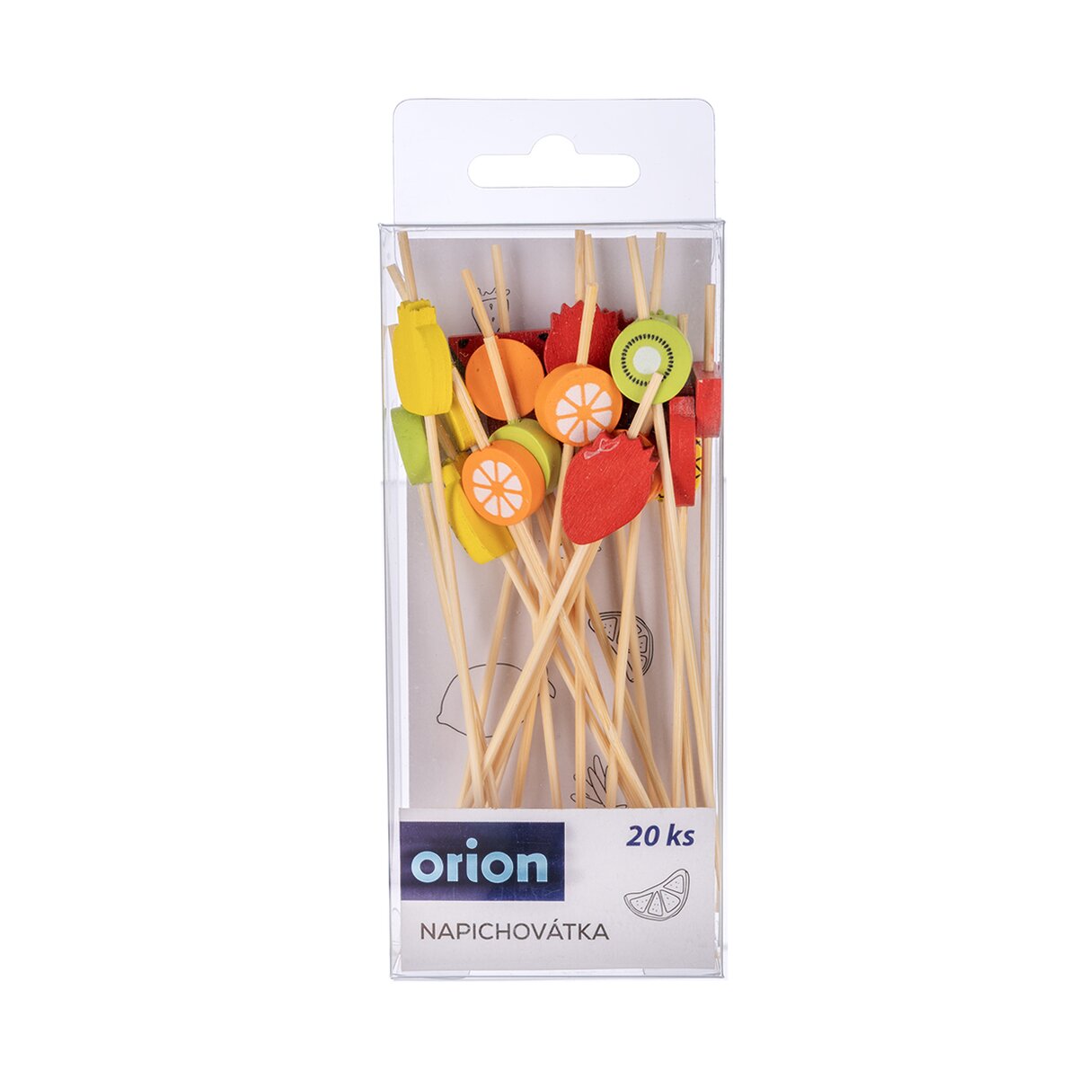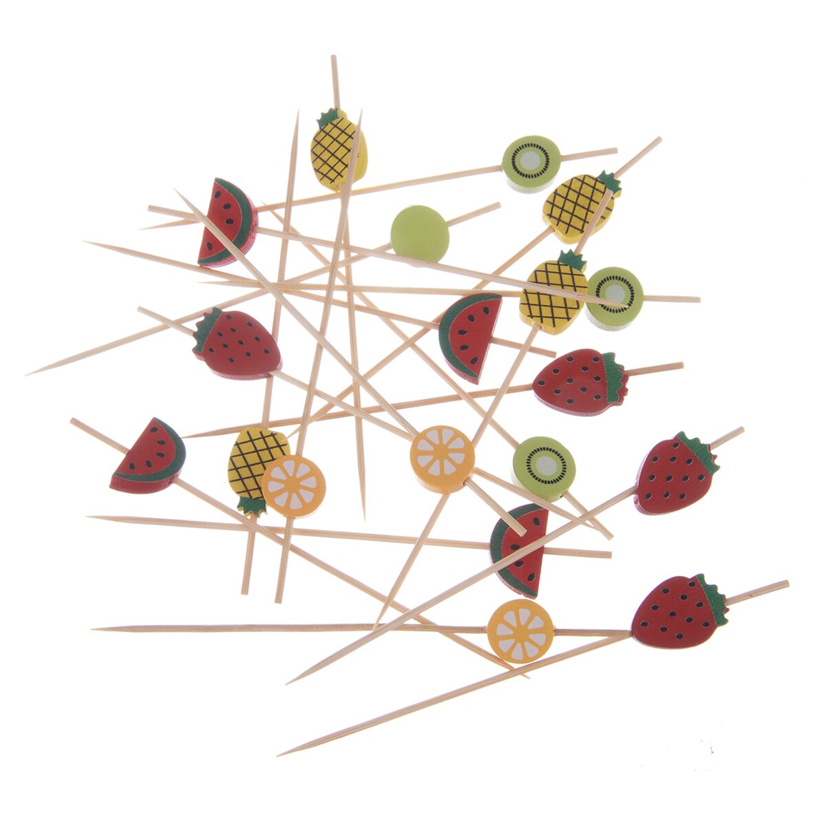 Kód produktu 151614Bambusová napichovátka s barevnou ozdobou ve tvaru OVOCE využijete při servírování drobného slaného nebo sladkého pohoštění při různých příležitostech. Jsou v sadě 20 ks a mají délku 12 cm.