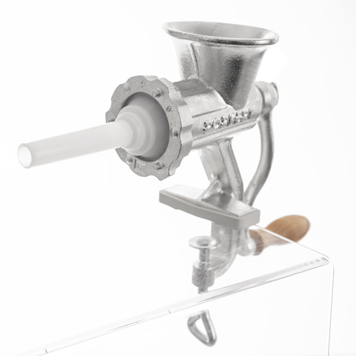 Ideálně je namlít si maso na domácí klobásky přes desku s velkými oky, zachovají se tak kousky masa, které pak vyniknou na řezu, část samozřejmě najemno, aby se směs dobře spojila. Řezné desky vedeme je v sortimentu. Pak stačí vložit do příruby vybranou trubičku, utáhnout na strojku maticí, na konec soupravy navléknout vymytá, čistá střívka a plnit je v takové délce, jak potřebujete.
