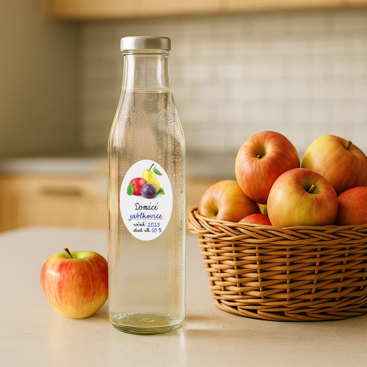 K tomuto označení skvěle poslouží stylové papírové samolepky, které dodají lahvím osobitý vzhled. Na etiketu můžete napsat druh sirupu, datum nebo rok výroby, případně u pálenky i obsah alkoholu. Takové označení pomůže udržet přehled ve špajzu a snadno poznáte, co jste si kdy připravili.
