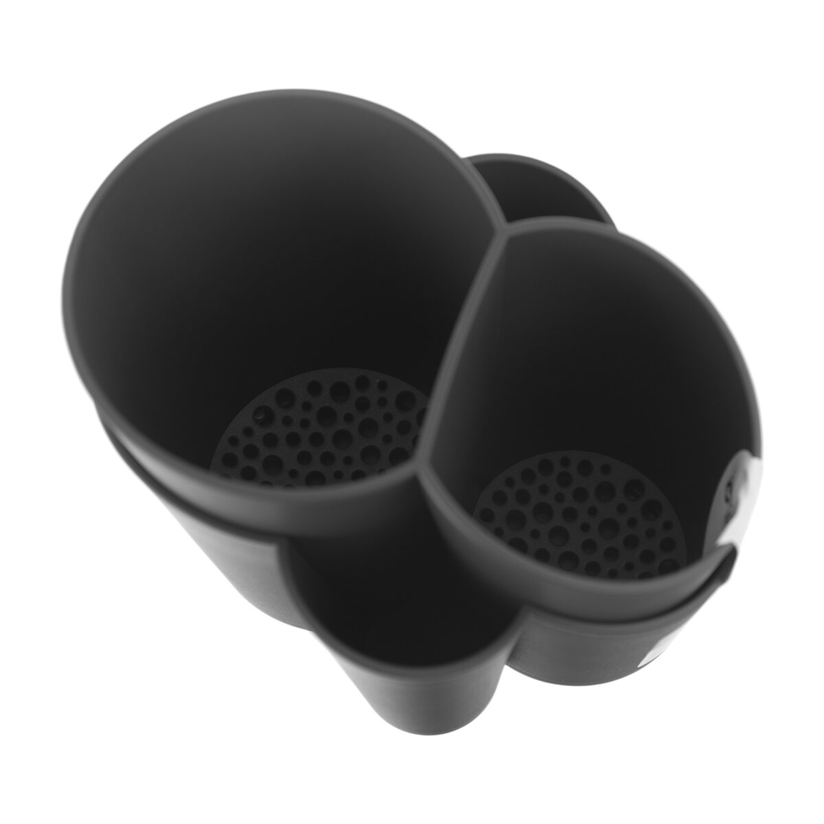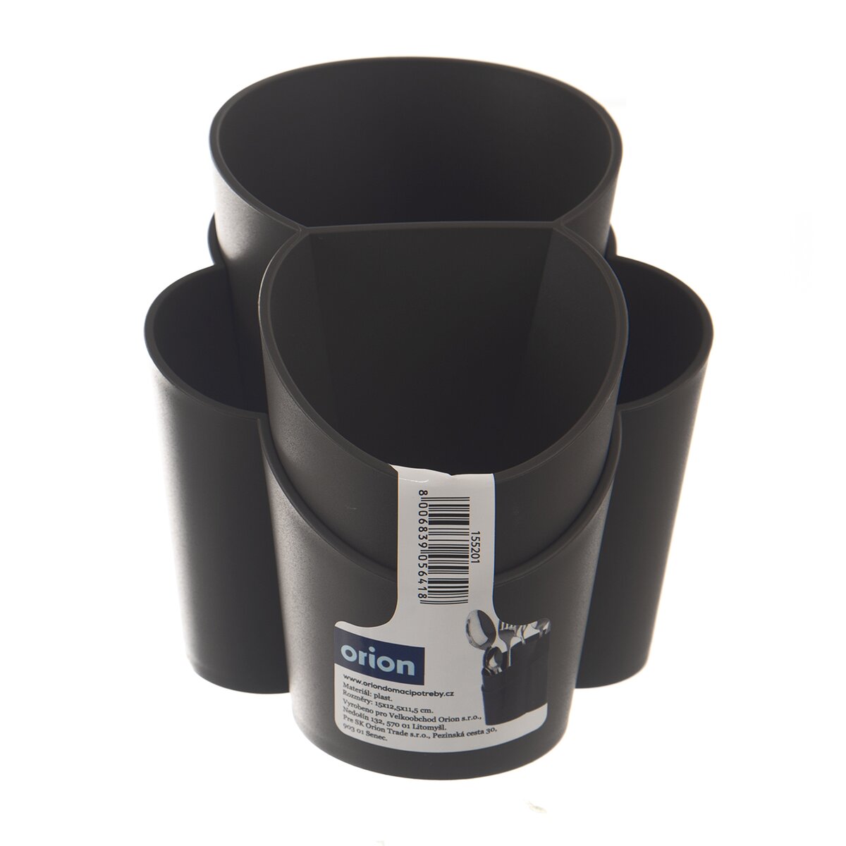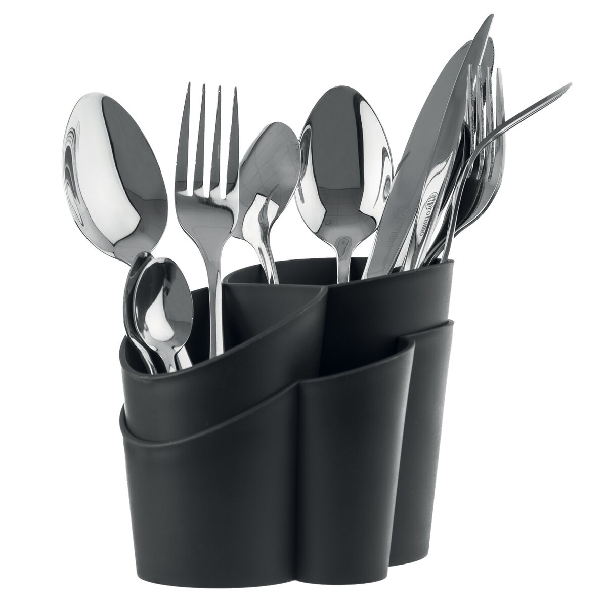 Šikovný dělený odkapávač na příbory v šedé barvě, se 4 otvory, kam lze vložit běžné nebo steakové příbory, lžičky a další náčiní, které je třeba nechat po umytí odkapat. Otvory v dolní středové části odkapávače umožní odtok vody do odnímatelné základny, lze je samozřejmě použít i samostatně.