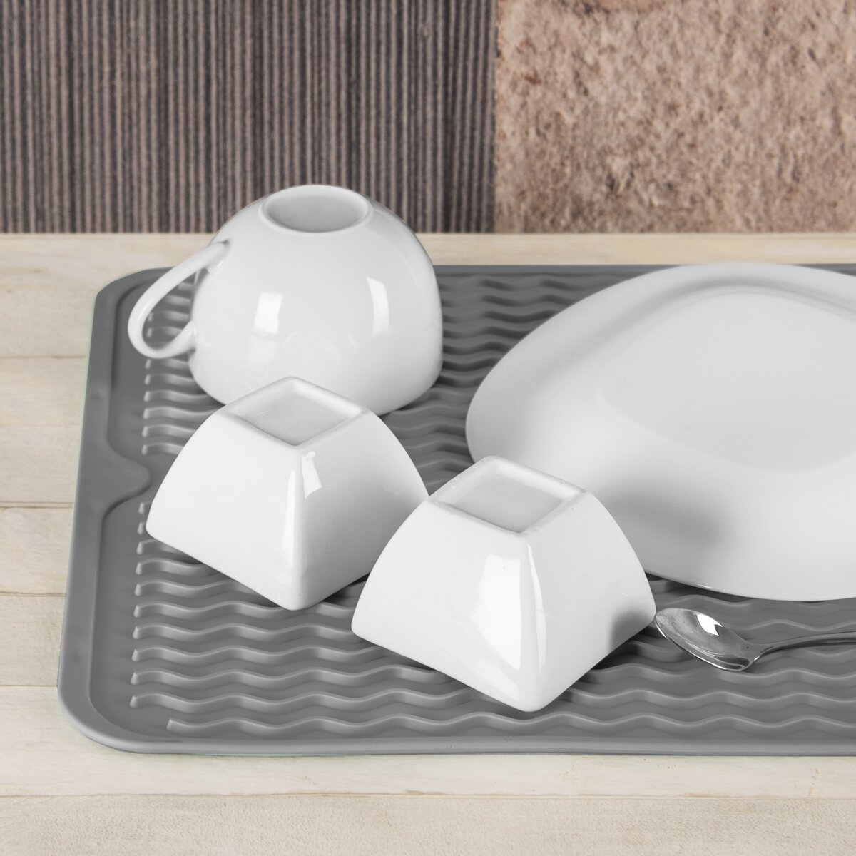 Diky měkkému materiálu a vystouplé struktuře nedojde k poškození choulostivějšího nádobí, např. skla, keramiky a porcelánu. I pokud nemáte již v myčce dostatek místa nebo potřebujete narychlo umýt pár kousků nádobí, pak je tento šedý odkapávač ideálním pomocníkem.