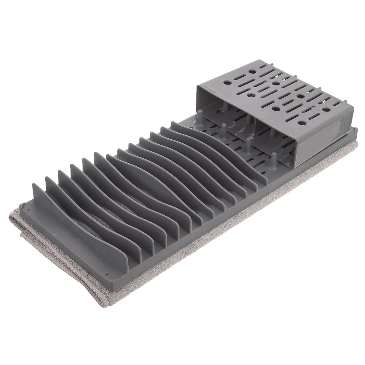 Součástí je i podložka z velmi savého mikrovlákna, které chrání linku před případnou potopou. Doporučujeme ji prát na 40 °C, nepoužívat aviváž ani bělící prostředky. Výhodou tohoto odkapávače je i jeho skladnost, zásobník na příbory můžete sklopit a ušetřit tak místo ve skříňce.