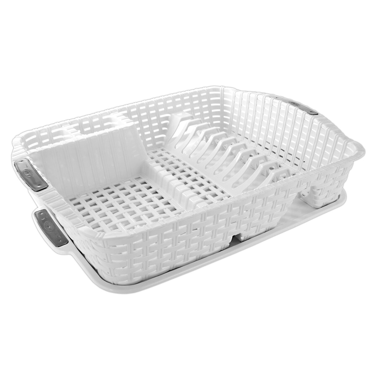 Kód produktu 150674Odkapávač na nádobí s tácem. Členěný - sekce na příbory, talíře a na ostatní nádobí. Materiál: plast. Dekor ratanu. Barva bílá. Rozměry: 48x38x10 cm.