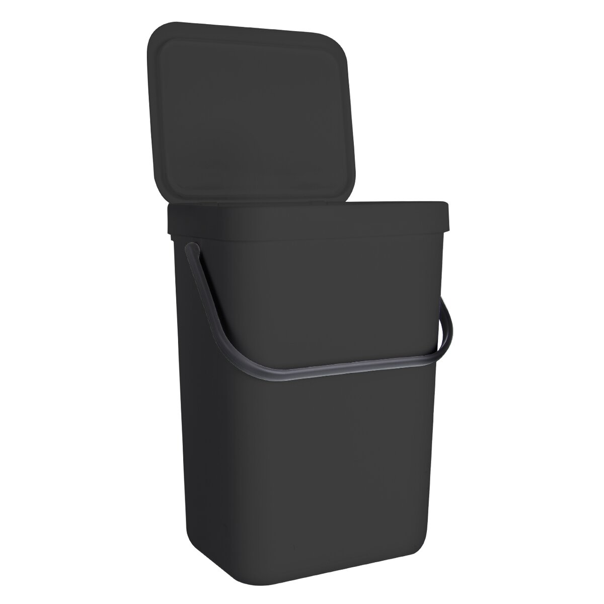 Kód produktu 731347Černý plastový koš na odpadky o objemu 10 l s odklápěcím víkem a odnímatelným rámem pro upevnění sáčku.