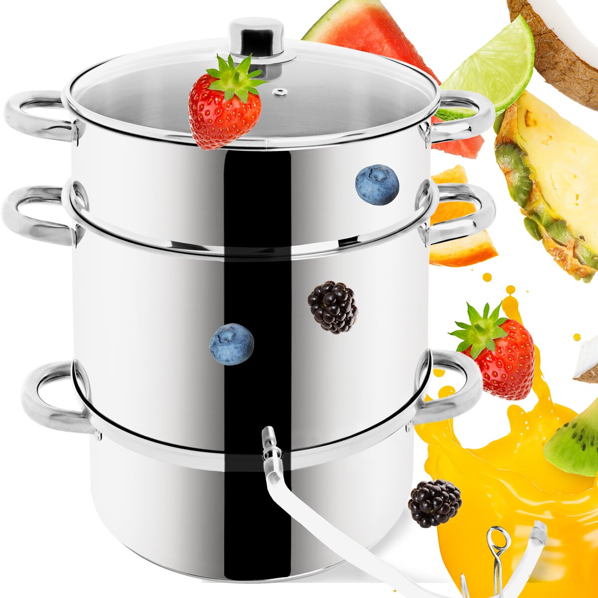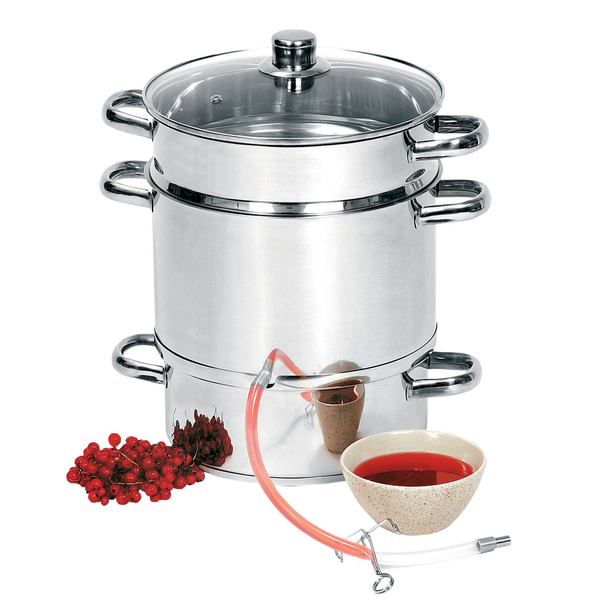 Spodní varná nádoba má sendvičové dno, které efektivně rozvádí teplo a je vhodná i na indukční vaření. Nalitá voda varem propařuje ovoce, které stačí umyté a přebrané vložit do horní nádoby s perforovaným dnem. Šťáva se uvolňuje do prostředního patra, odkud postupně odtéká vypouštěcí hadičkou. Tu lze přímo stáčet do lahví nebo většího hrnce a s cukrem nechat želírovat.