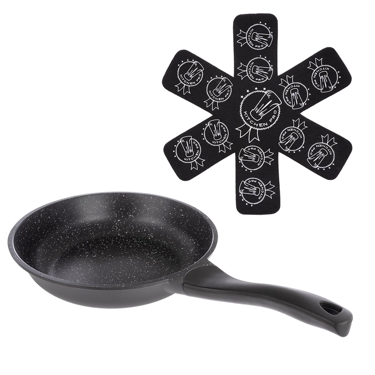 Součástí výrobku je ochranná podložka mezi pánve, která Vám zajistí, že při uložení nádobí do sebe se povrch pánví i jiných nádob nepoškrábe a nepoškodí - odolná syntetická netkaná textilie.