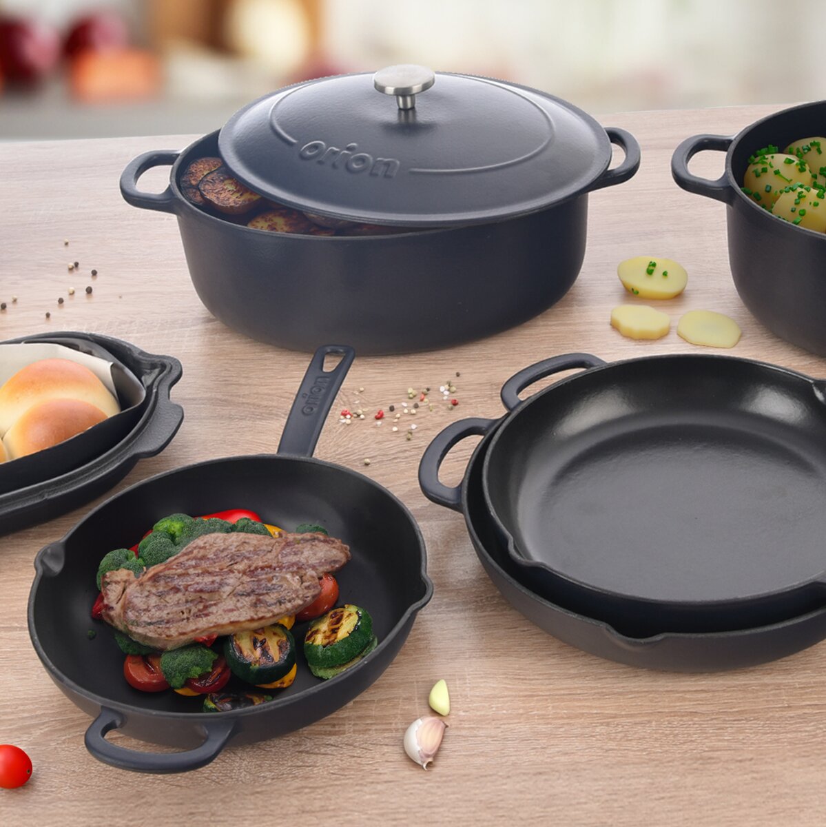 - pánve výšky 4,5 cm a v držadle 6 cm jsou skvělé pro pomalé pečení při nižší teplotě, ale můžete je, jako každou litinovou nádobu, rozpálit na vysokou teplotu, např. při prudkém opékaní masa, aby se zatáhlo (až při 250 °C)