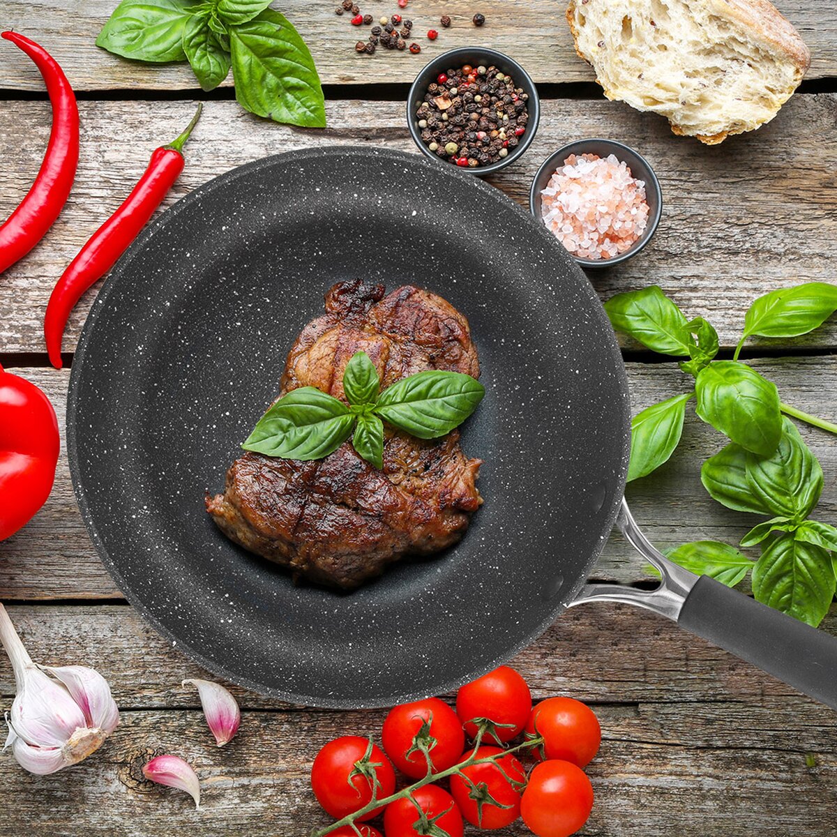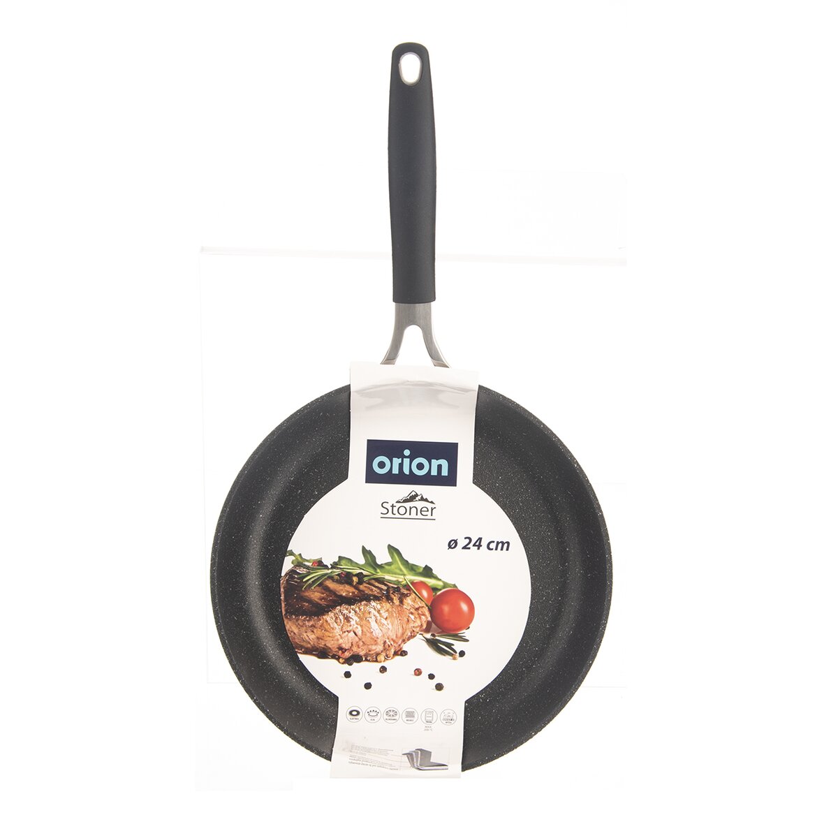 Kód produktu 112927Kvalitní pánev STONER pr. 24 cm s hrubým povrchem charakteru kamene, který zajistí rovnoměrné propečení. Vhodná na indukci, do trouby i myčky.