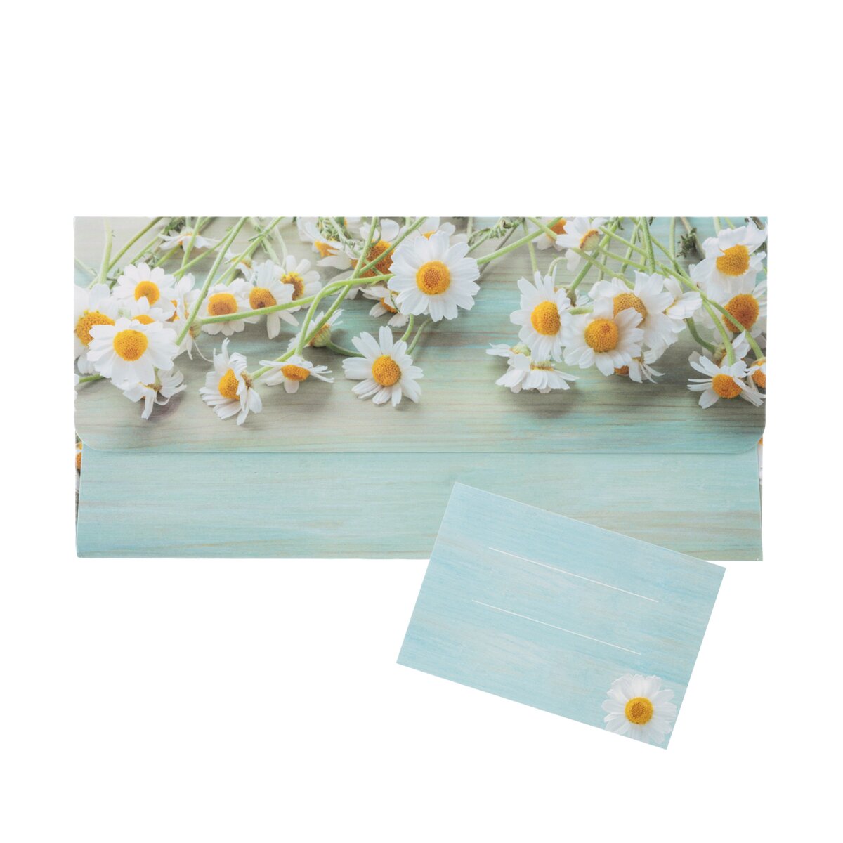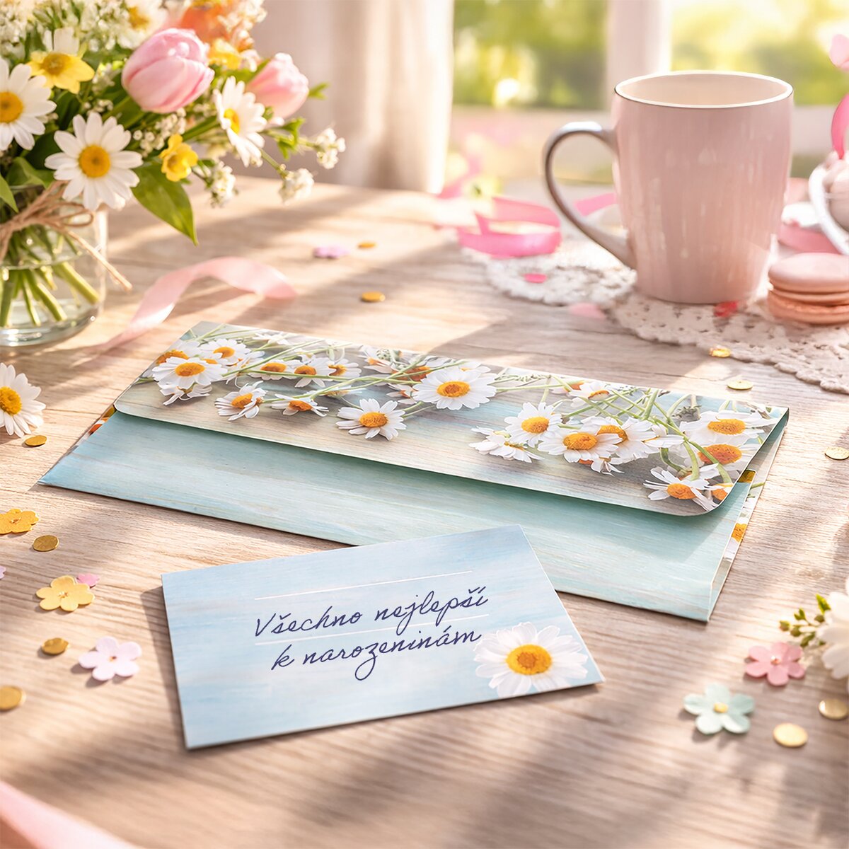 Kód produktu 842379Papírová obálka s vloženou kartou, kam lze napsat poděkování či vzkaz obdarovanému, je určena k decentnímu předání hotovosti, voucheru a různých poukazů. Zdobí ji jemný dekor heřmánků.