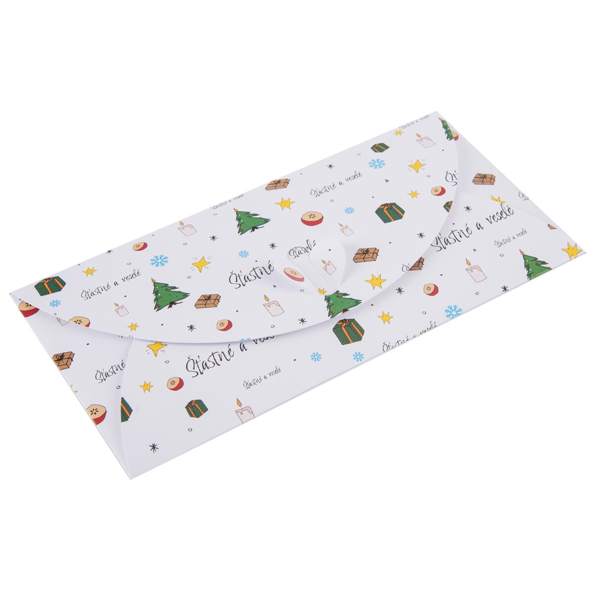 Kód produktu 842327Papírová obálka s dekorem se vám bude hodit, pokud chcete někomu darovat např. lístky do divadla, dárkový poukaz nebo finance. Velmi jednoduše ji opakovaně otevřete a zase zavřete. Materiál: papír. Rozměry: 22x11 cm.