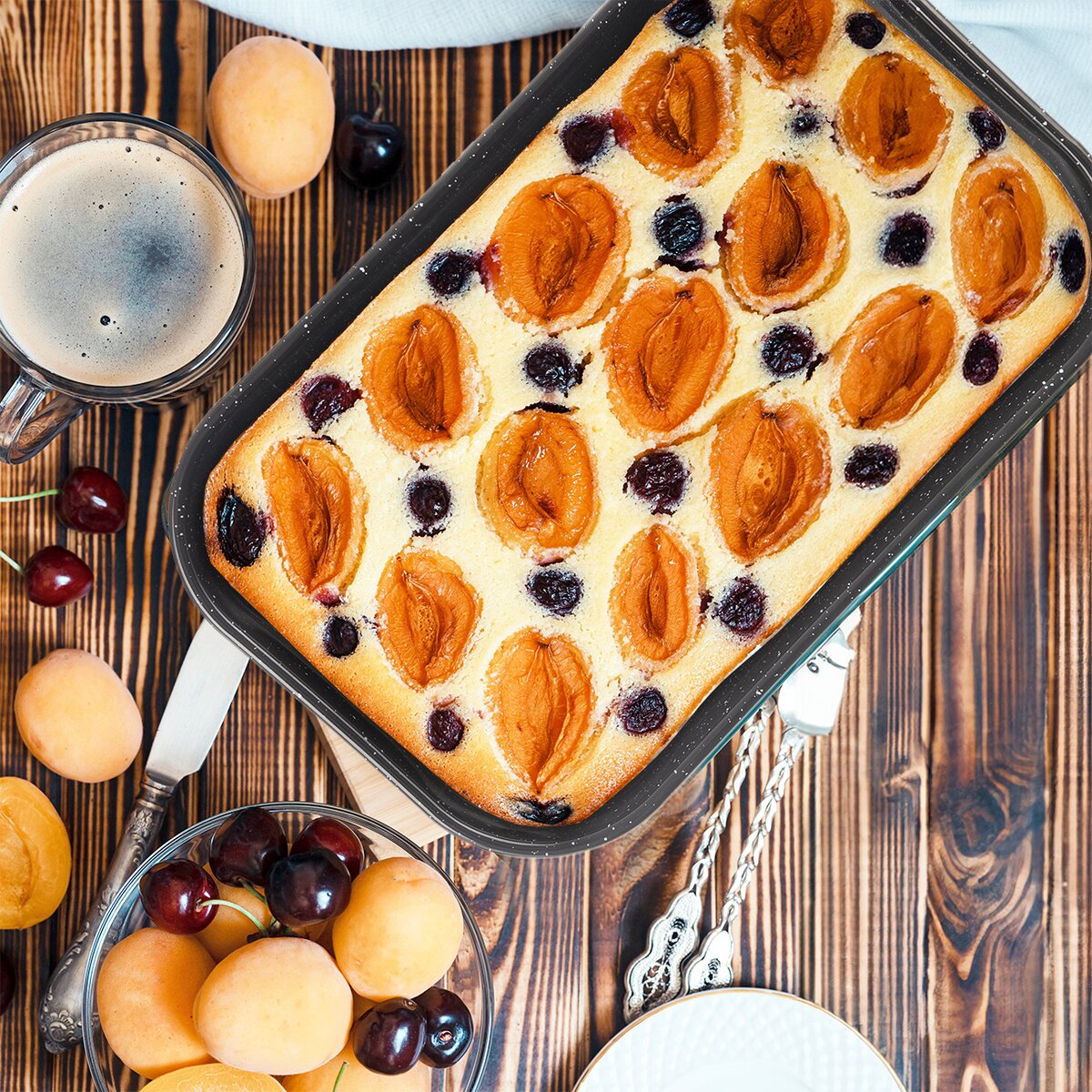 Marinované pečené plátky, porcovaná drůbež, nádivky, nákypy, u nichž se vytvoří krásná kůrčička, ale i litý koláč nebo klasické kynuté buchty jako z pohádky budou upečené raz dva. Tento hluboký pekáč se vejde do běžných rozměrů kuchyňské trouby.