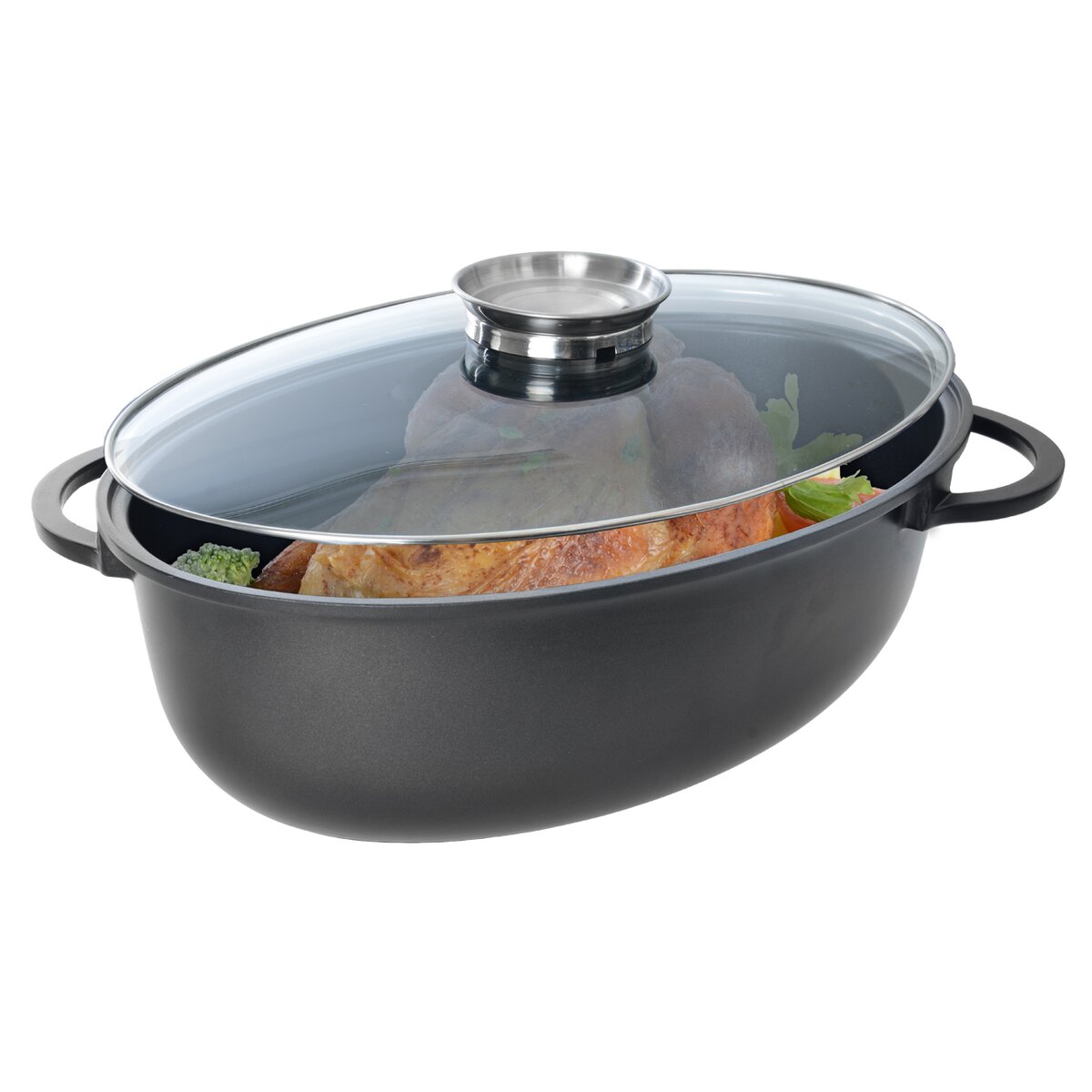 Kód produktu 123766Masivní pekáč s nepřilnavou povrchovou úpravou a se skleněným víkem s aroma úchytem, který umožní dochucování pokrmu během pečení.