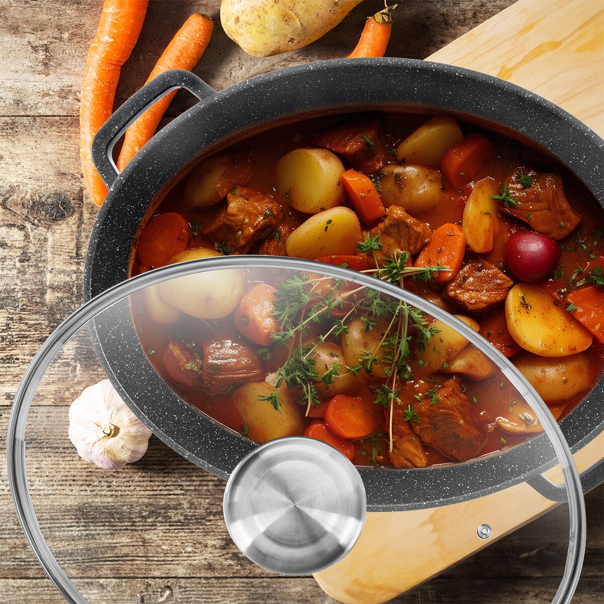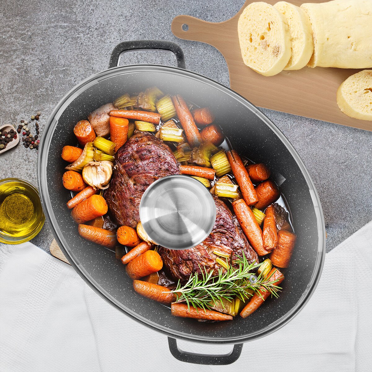 - skleněná poklice je opatřena aroma úchytem, do něhož můžete nalévat víno, aromatizované oleje a dochutit pokrm bez nutnosti odklopení poklice
