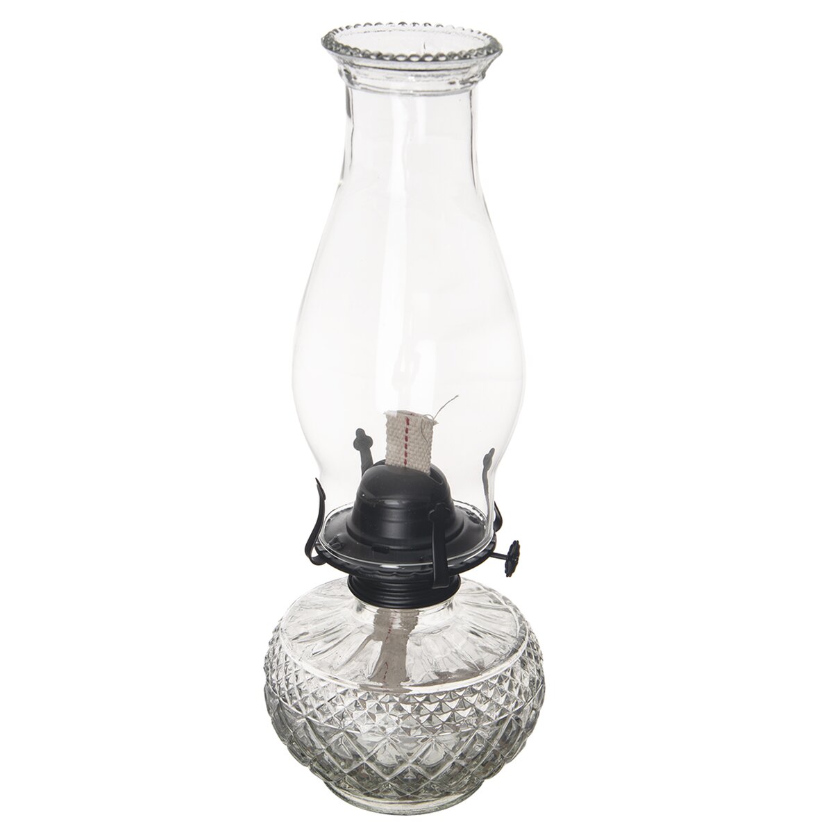 Kód produktu 822259Petrolejová lampa se skleněným tělem, klasickým cylindrem s dekorativní horní částí a bavlněným knotem slouží po naplnění petrolejem nebo lampovým olejem jako doplňkové světlo v interiéru.