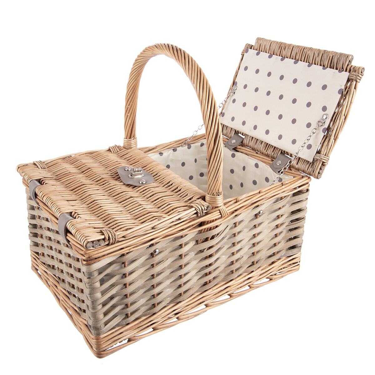 Kód produktu 730566Hranatý proutěný koš se dvěma víky a pevným držadlem má uvnitř látku a je ideální na piknik.