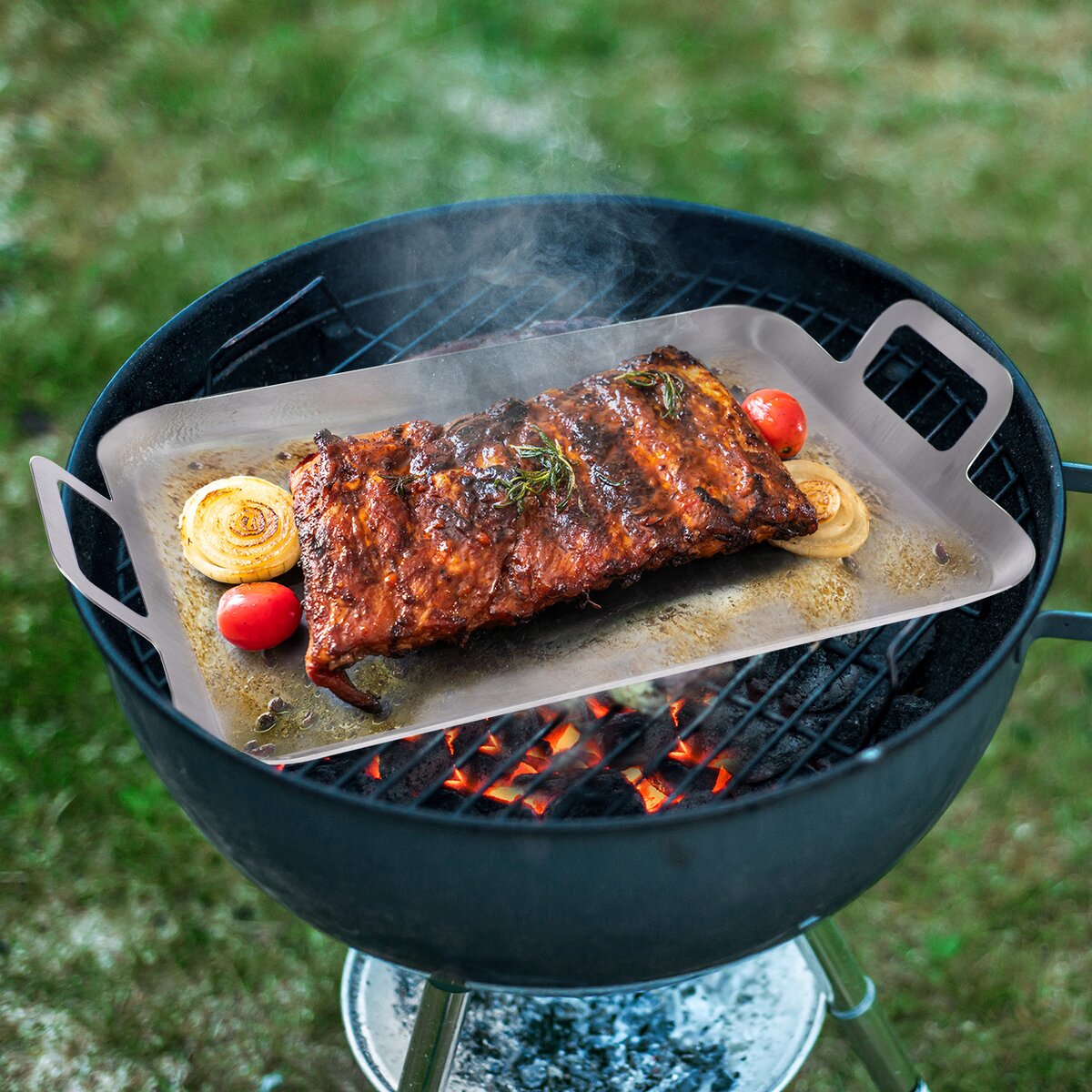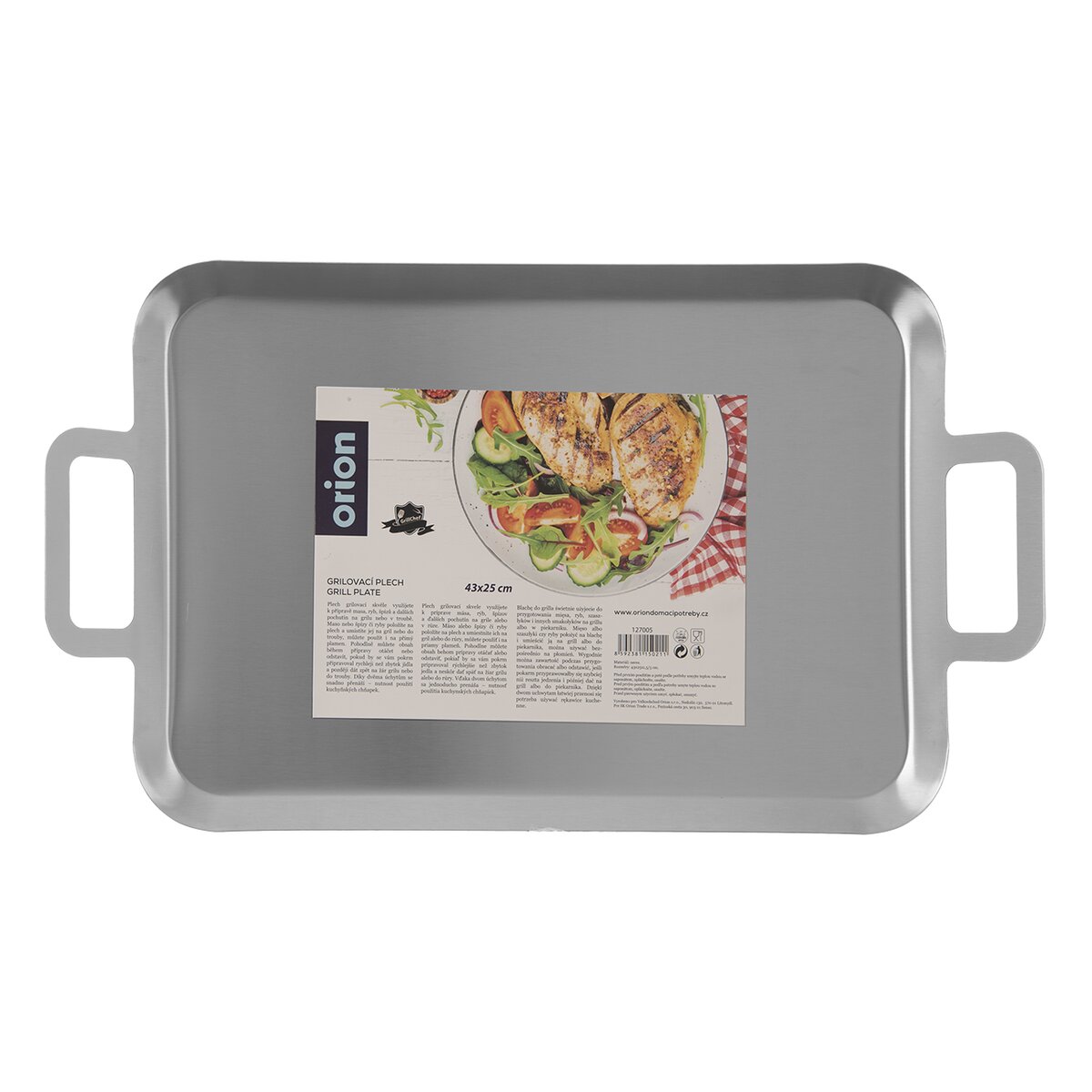Kód produktu 127005Nerezový grilovací plech s hladkým povrchem a držadly pro přípravu masa, ryb, špízů, zeleniny, ale i pečiva v troubě i na grilu, vhodný i do myčky nádobí