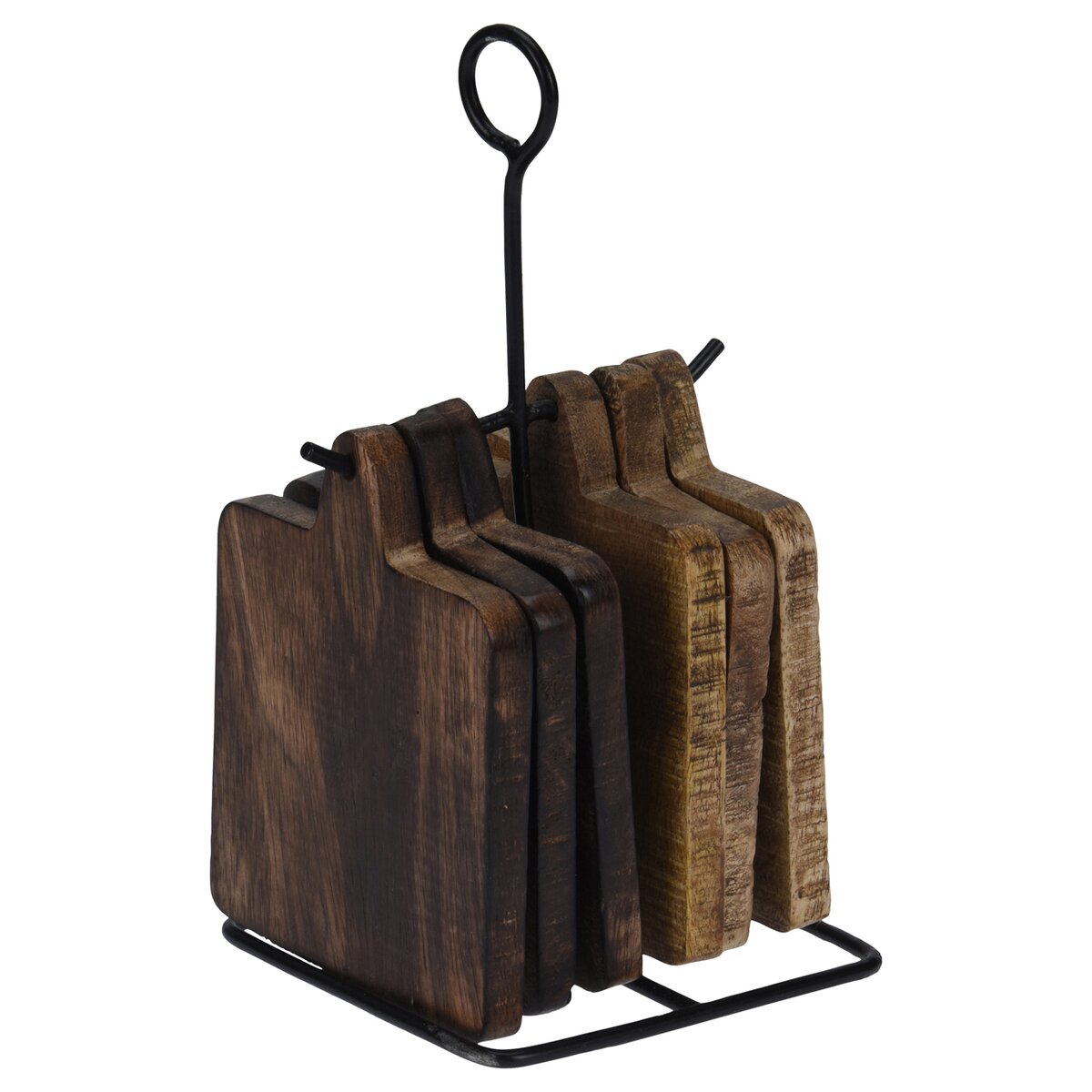 Kód produktu 126835Sada dřevěných podtácků ve tvaru krájecího prkénka ve dvou barvách, uložených v kovovém stojanu, díky kterému celý set přenesete na terasu, zahradu.