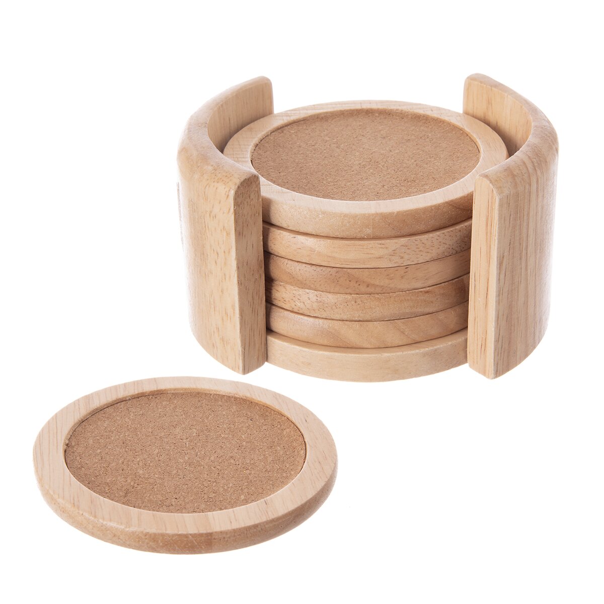 Stylová sada z přírodních materiálů, která zachrání váš stůl před světlými skvrnami. Obsahuje dřevěný stojan a šest podtácků, které mají základ z gumovníkového dřeva a výplň z korku.