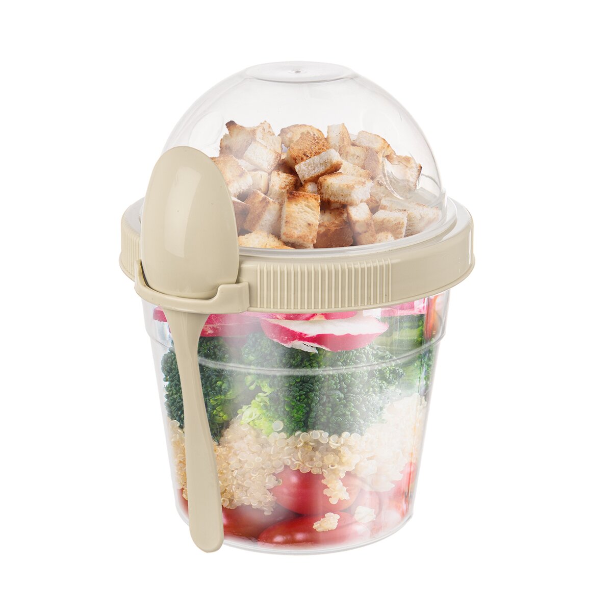 Kód produktu 121783Transparentní pohár o objemu 0,5 l s víčkem na závit, kam lze zasunout lžičku. Je doplněn horním zásobníkem, do kterého lze uložit svačinu nebo lehký oběd do práce, školy či na výlet.
