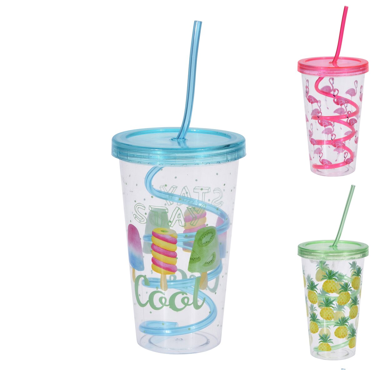 Pohár s barevným dekorem s víčkem a brčkem. Materiál: plast. Assort barev a dekorů. Rozměry: objem 0,45 l, pr. 10 cm, v. 15,5/23 cm.