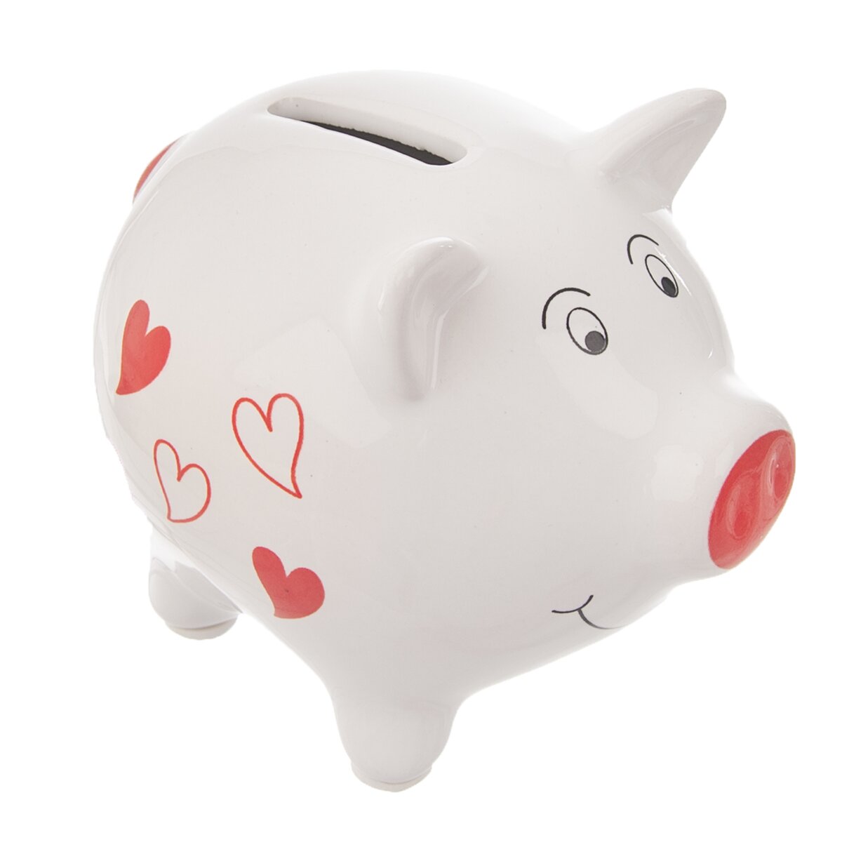 Jestliže si chcete našetřit na vánoční dárky, víkendový wellness pobyt nebo nový mobil, zkuste házet nastřádané mince do této klasické keramické pokladničky. Má tvar roztomilého bílého prasátka, které má na boku červená srdíčka. Nebo jej naplňte mincemi a darujte ho novomanželům nebo jubilantovi.