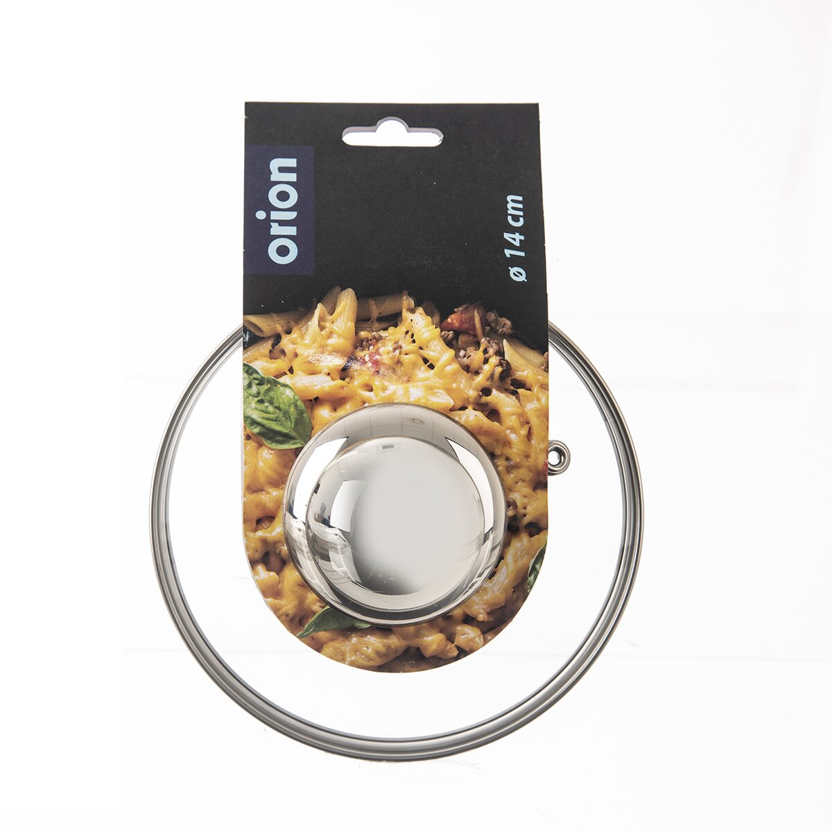 Praktická skleněná poklice průměru 14 cm s nerezovým lemem a úchytem pro ekonomické vaření. Vhodná pro vaření, do trouby i myčky.