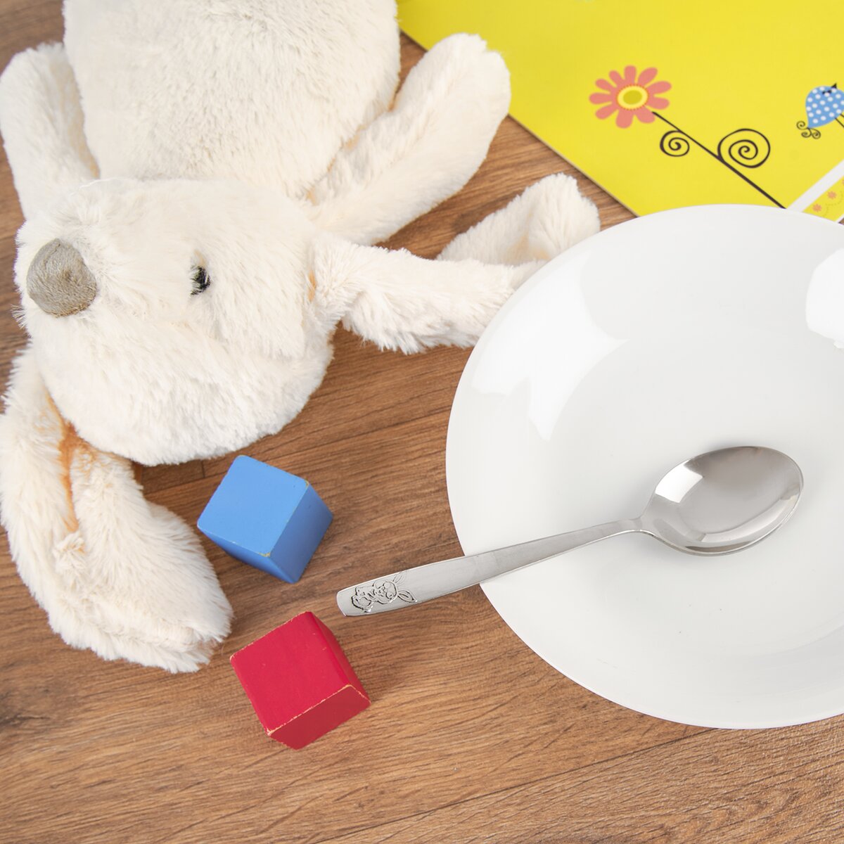 Dětská lžička s rytým motivem roztomilého zajíčka slouží pro nácvik správného stolování. Svou velikostí a váhou je uzpůsobena malým dětským ručkám.