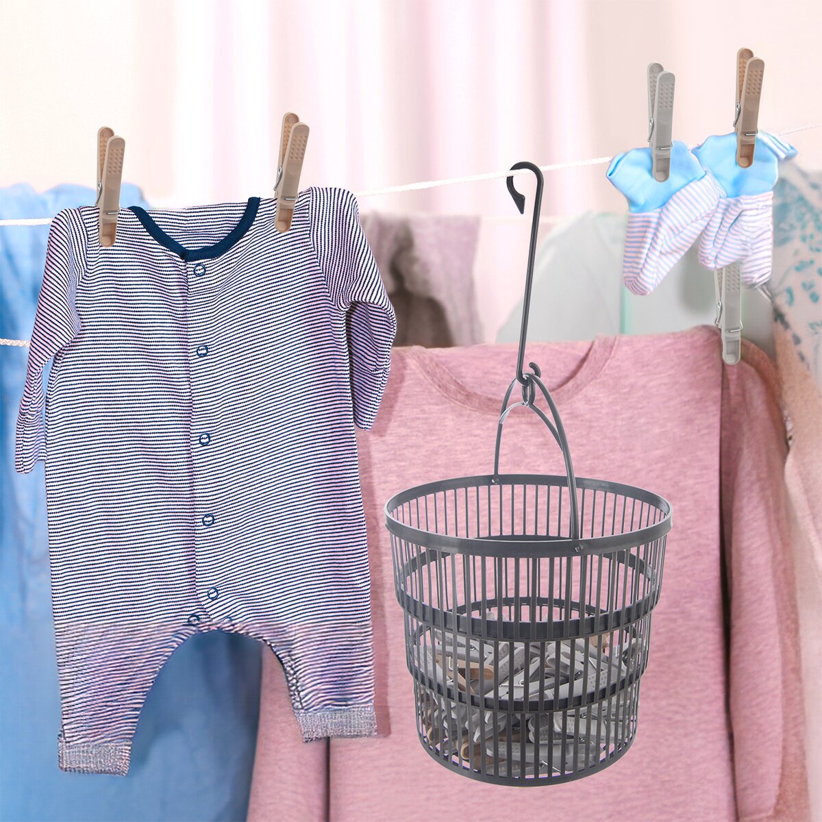 Košík lze na šňůru nebo konstrukci sušáku zavěsit díky očku v horní části. Pokud jej po uklizení prádla odnášíte do domu, stačí jej sejmout ze šňůry a lehce jej složit, takže díky výšce 7 cm nezabere místo ani v zásuvce nebo regálu. Rozložený má i s držákem výšku 38 cm.