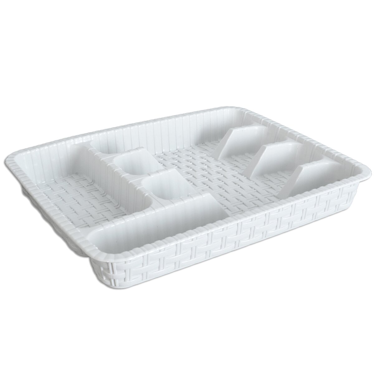 Příborník Vám pomůže udržet pořádek v zásuvkách kuchyňské linky. 5 sekcí. Materiál: plast. Barva bílá, vzor ratan. Rozměry: 29x37,5x5 cm.