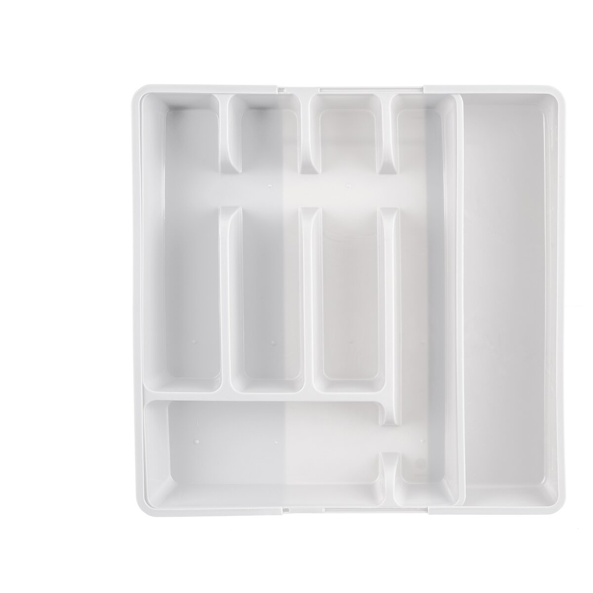Kód produktu 150748Bílý plastový příborník má velikost 27,5/44x36,5x4,3 cm. Je rozdělený na 5 základních sekcí, navíc se dvěma dalšími sekcemi, které lze vysunout do stran.