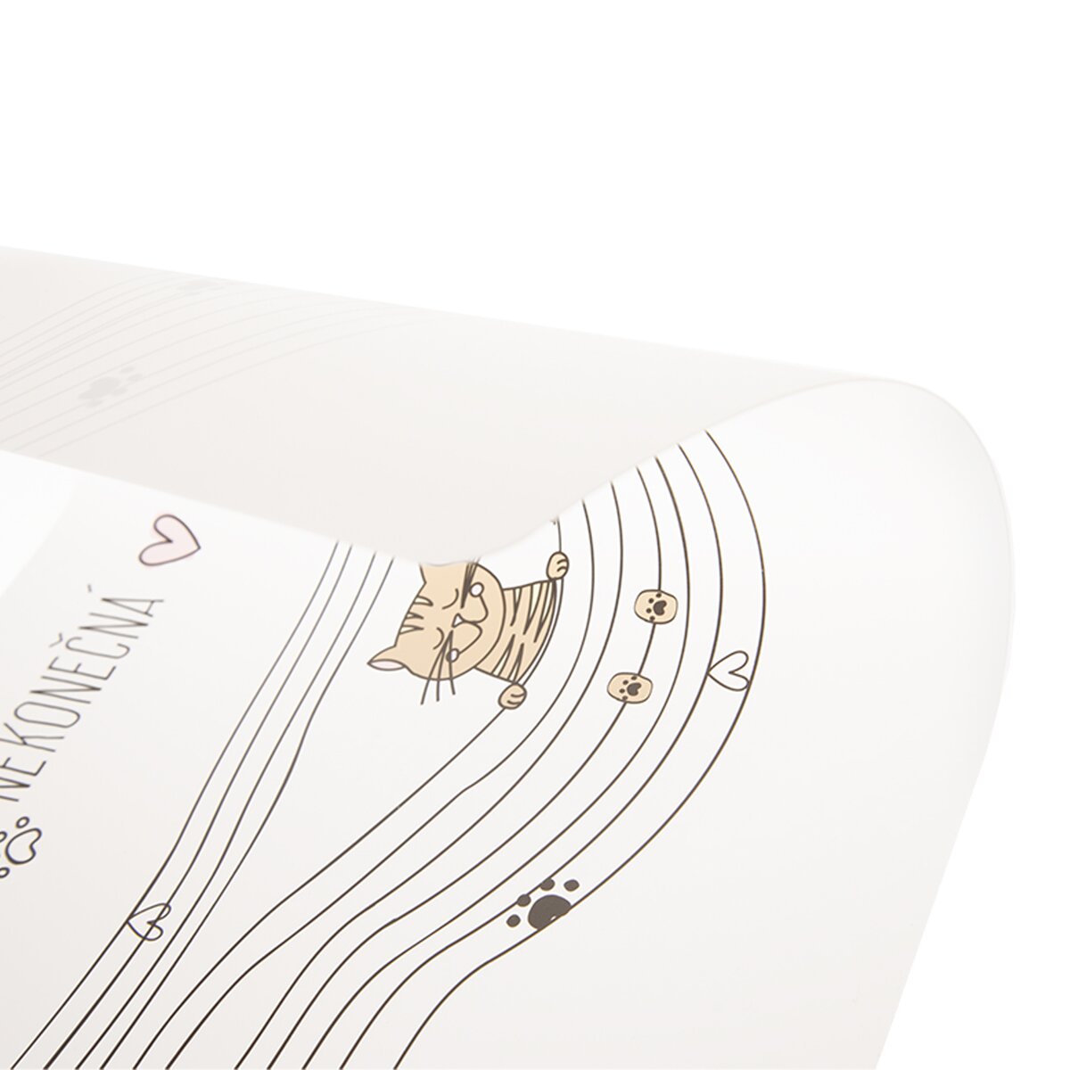 Kód produktu 728034Moderní prostírání NEKONEČNÁ LÁSKA navodí příjemnou pohodu při stolování. Jemný dekor linek, tlapek a vykukující kočičky je nejen hezký, ale doma či na terase toto prostírání ochrání stůl před ušpiněním.