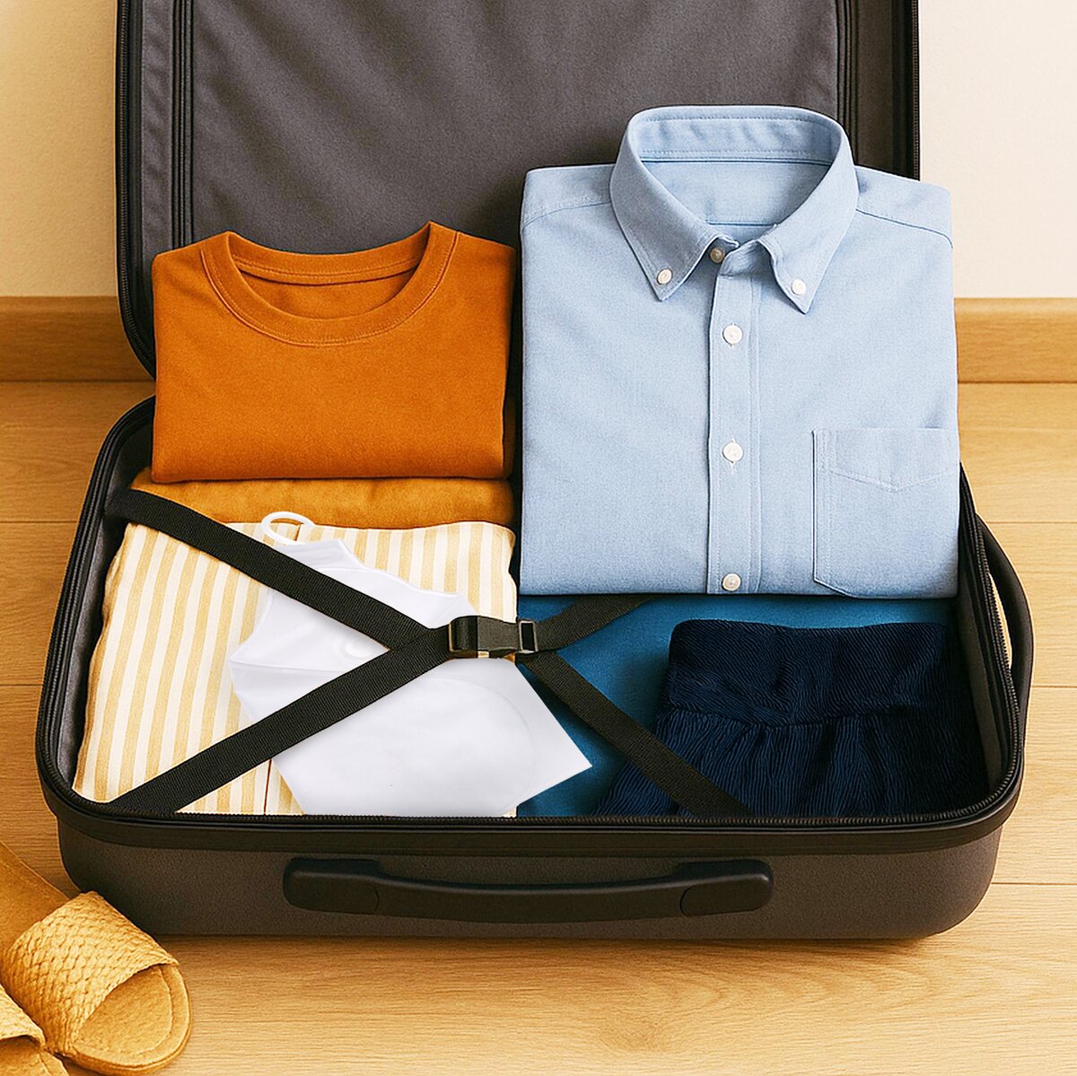 Ramínko je velmi lehké, skladné a v zavazadle zabere minimum místa – perfektní volba pro cestování. Je vyrobeno z plastu PP a háček, za který jej lze i s oděvem zavěsit na šatní tyč nebo na štendr, je z PVC.