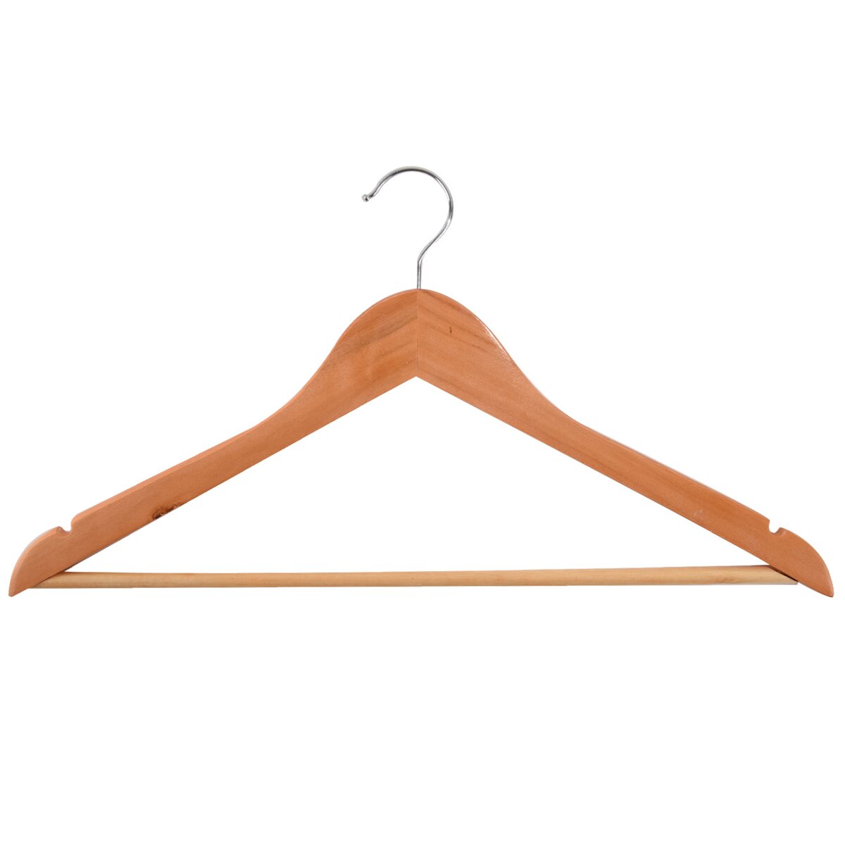 Základním vybavením každé skříně je pořádná zásoba ramínek. Toto dřevěné ramínko umožňuje uložení oblečení ve svislé poloze a pověšení kalhot či sukní na spodní tyč či postranní úchyty.