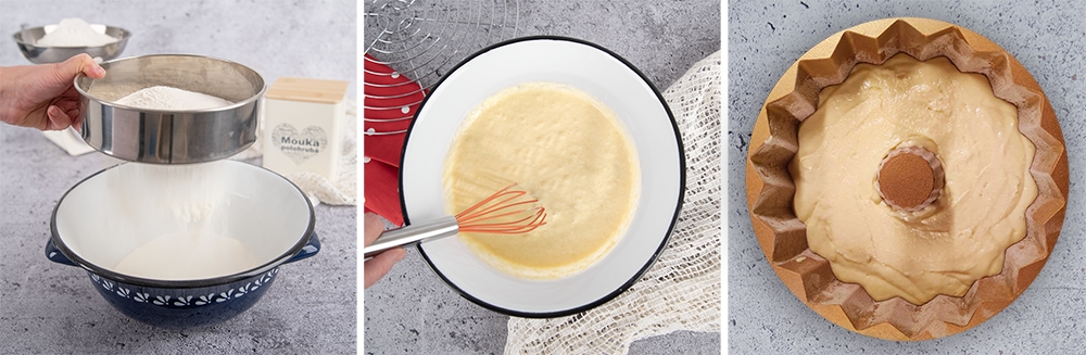 Je to jednoduché a rychlé. Formu stačí vystříkat olejem ve spreji a vysypat moukou, bábovka půjde po upečení krásně vyklopit. Předehřejte si troubu na 170 °C a připravte si 2 misky. Do jedné misky dejte žloutky, do druhé bílky.