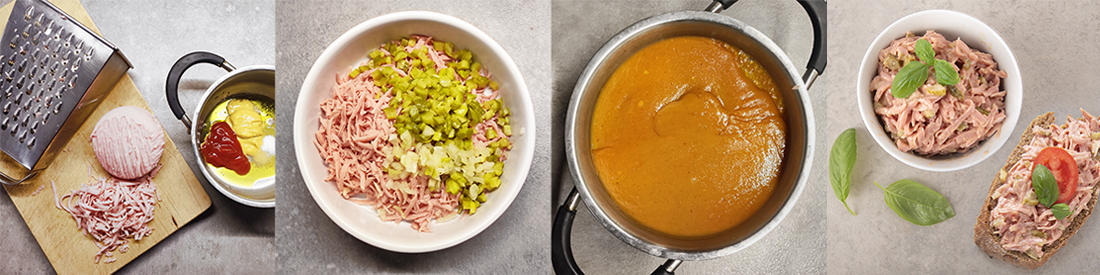 Na hrubém struhadle nastrouháme salám, nadrobno nakrájíme okurky a cibuli. V rendlíku se smíchá olej, ocet, hořčice, kečup a cukr a necháme vše krátce povařit, aby se chutě propojily. Vlažný přilijeme do mísy k salámu, okurkům a cibulce a promícháme. Po vychlazení v lednici přidáme k pomazánce ještě majonézu, která vše pěkně spojí a je to.