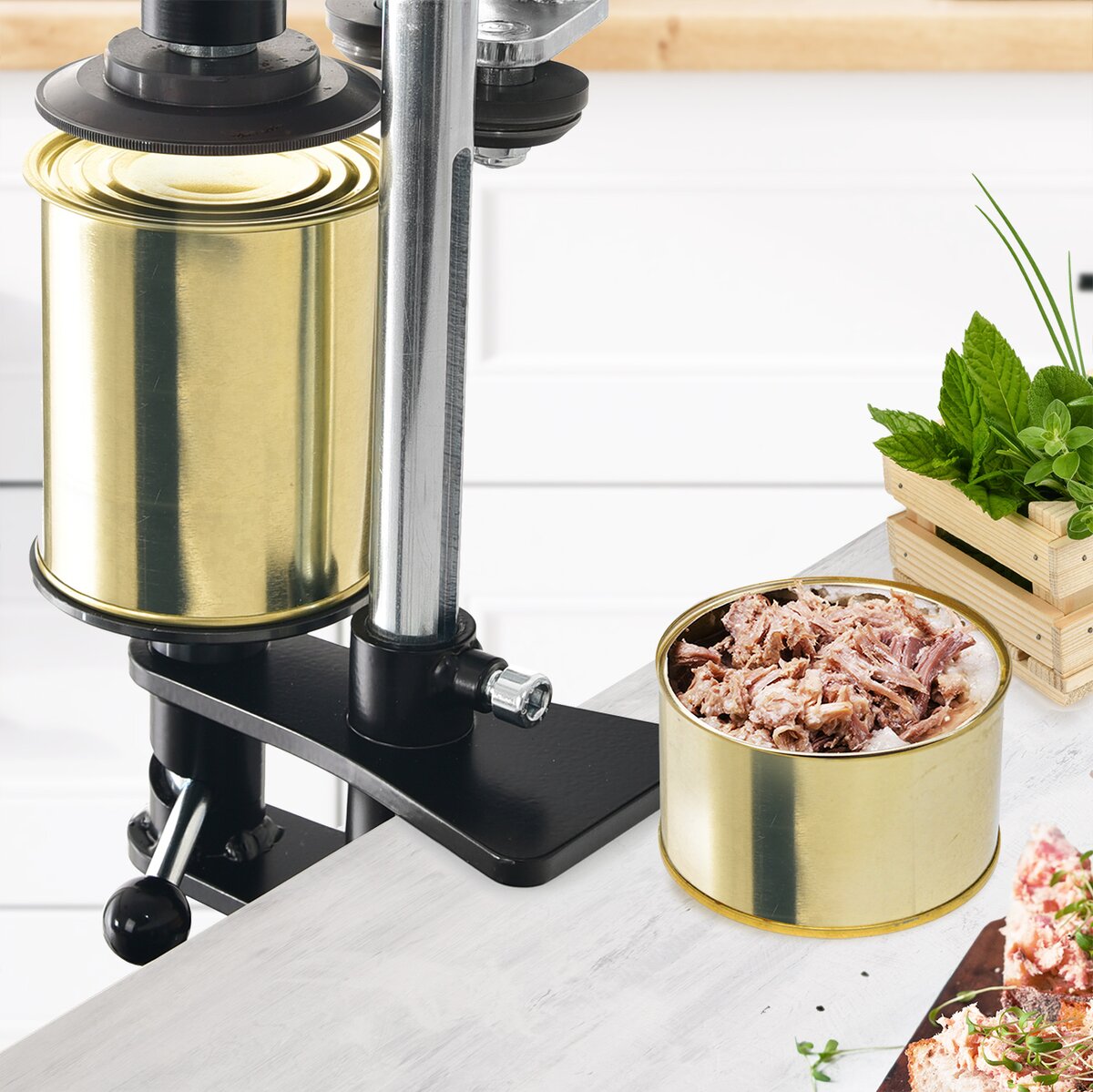 Ruční mechanický zavírač plechovek pomůže uchovat pomocí varu (sterilací) syrové, dušené a pečené maso. Plechovku po naplnění upevníte do zavírače a uzavřete ji pomocí dvou procesů upevňování víčka na plechovku – otáčením kliky. Plechovky pak sterilujete v hrnci (lépe 2x). Součástí výrobku je návod na sestavení, nastavení, používání a recept.