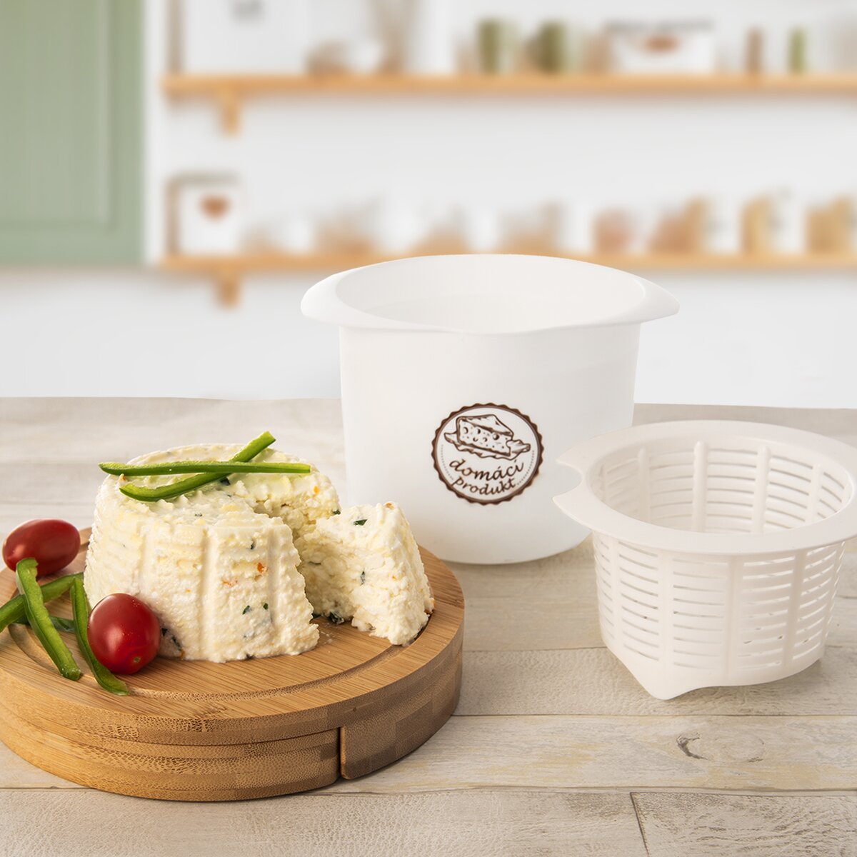 Kód produktu 142574Nádoba na výrobu sýrů, tvarohu i domácí lučiny s vloženým cedníkem k odkapávání syrovátky.