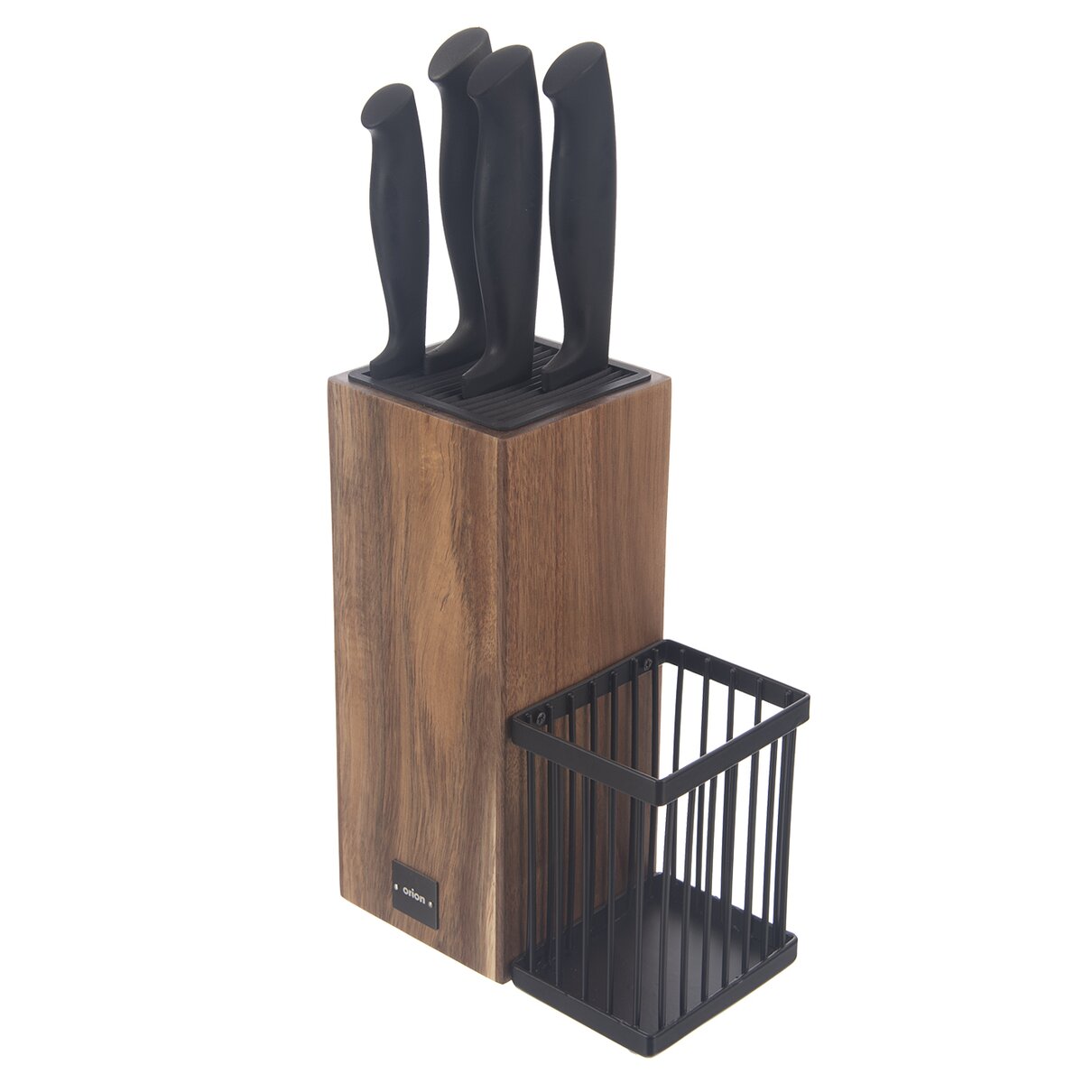 DÁREK k sadě tvoří šikovný stojan na nože s košíkem na drobné kuchyňské náčiní. Zajímavý stojan z akáciového dřeva je doplněn plastovým vkladem, do jehož podélných štěrbin lze zasunout nože různých velikostí. Součástí sady jsou kuchyňské nože s nerezovou čepelí a černou plastovou rukojetí, které slouží ke krájení, porcování, čištění masa, ovoce, zeleniny, ke krájení bylinek. Rozměry nožů: (čepel/celková délka) 7,5/18 cm, 12,5/23 cm, 14,5/27 cm, 20/32 cm, se zubatým ostřím 17,5/30 cm.