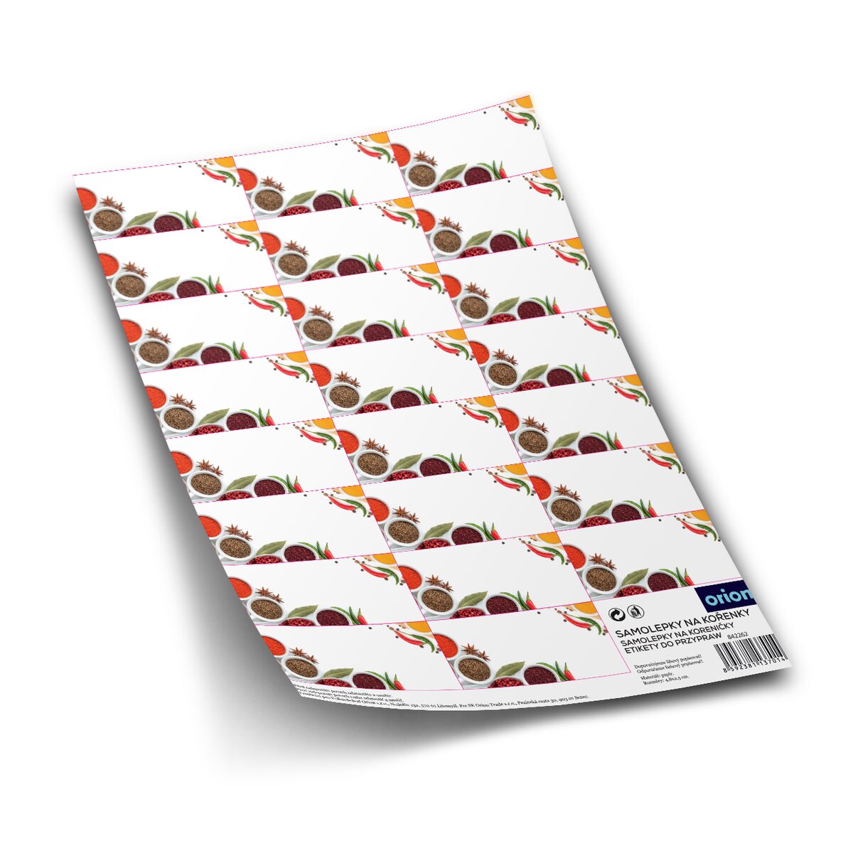 Jsou vyrobené z papíru a zdobí je tematický motiv vyobrazující misky plné koření. Každá samolepka má rozměr 4,8×2,5 cm.