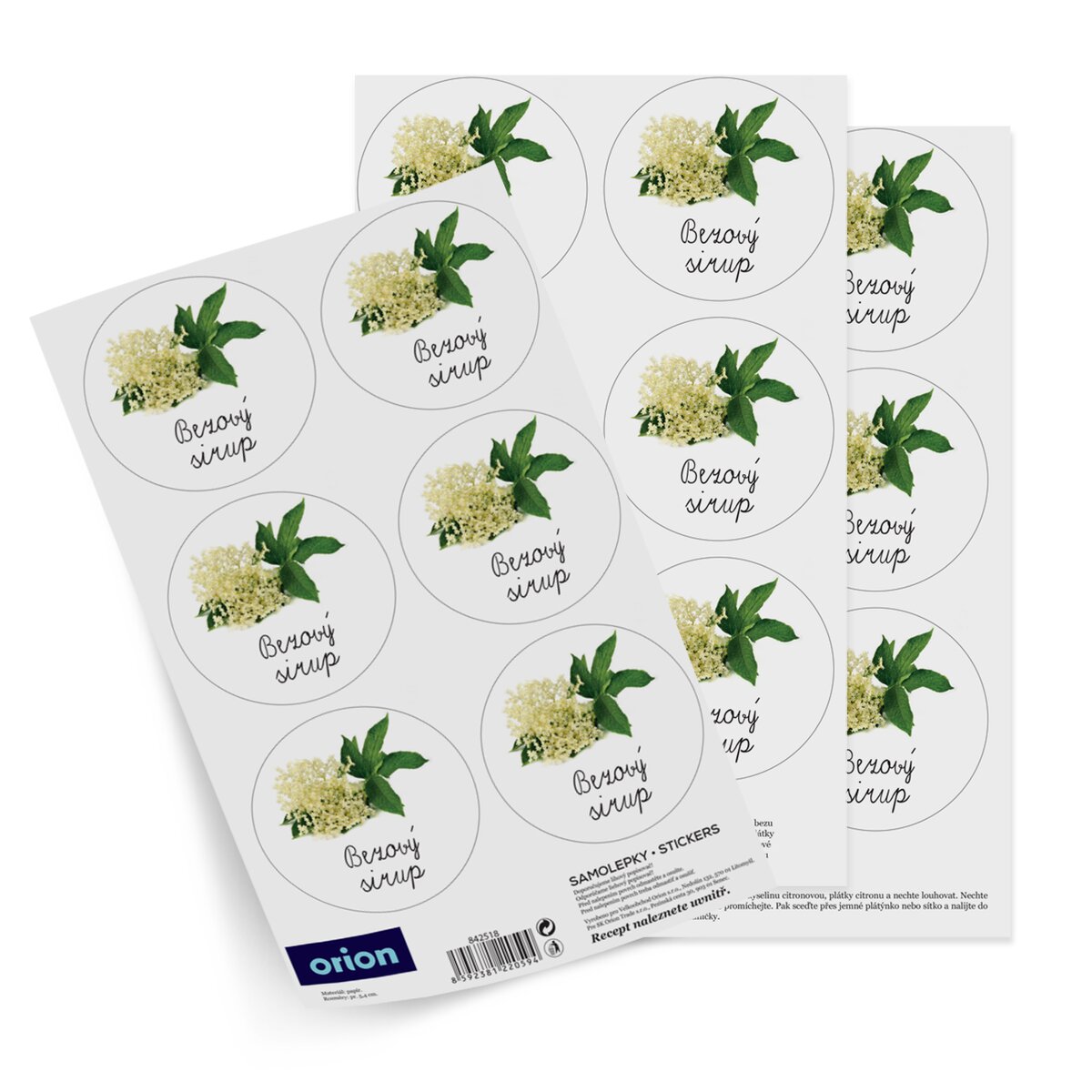 Sada papírových samolepek se výborně hodí k polepení láhví a sklenic, ve kterých chcete sirup uchovat. V balení jsou 3 archy i s receptem, jak sirup jednoduše připravit.
