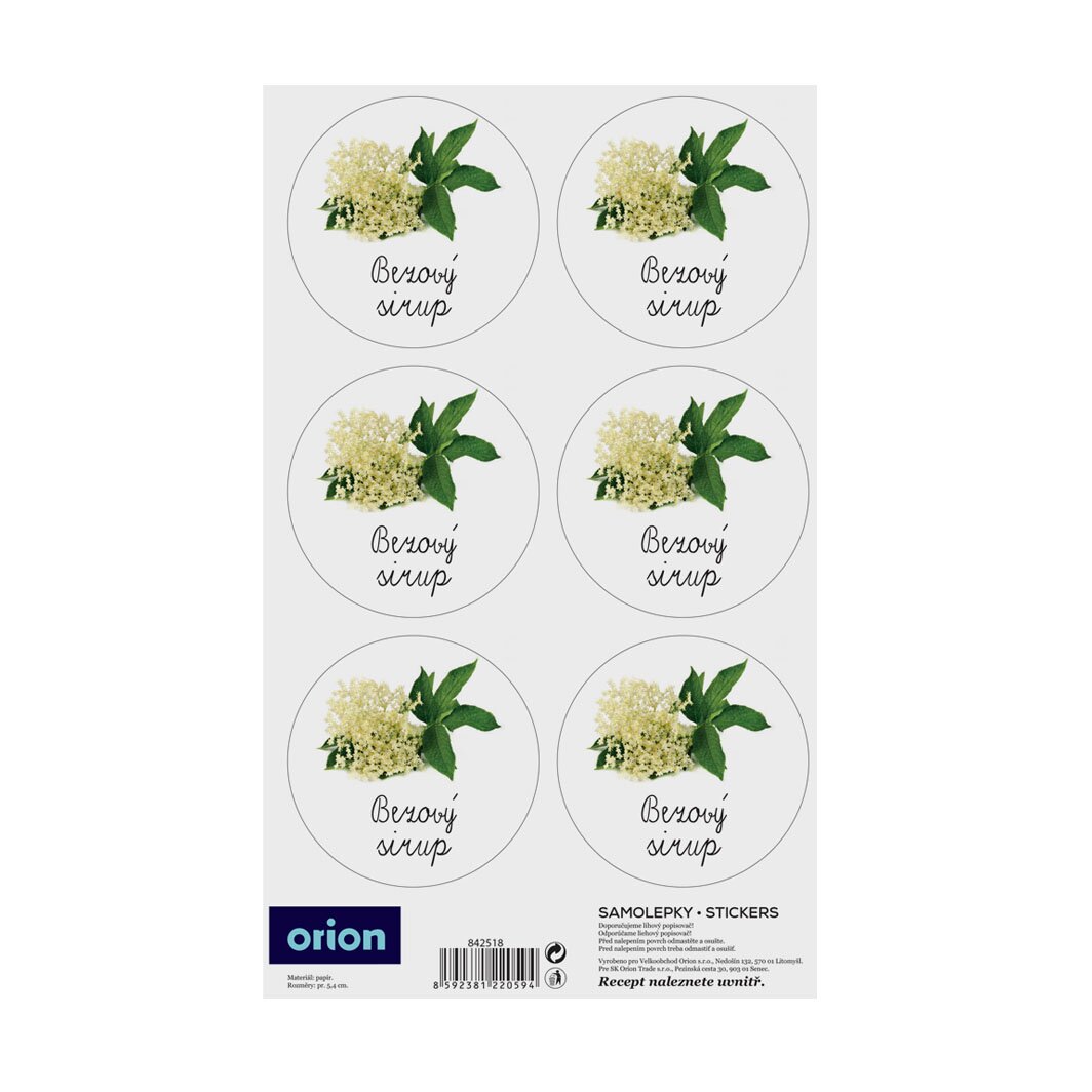 Kód produktu 842518Sada 18 kusů papírových samolepek s obrázkem a popisem BEZOVÝ SIRUP. Průměr jedné kulaté samolepky je 5,4 cm.