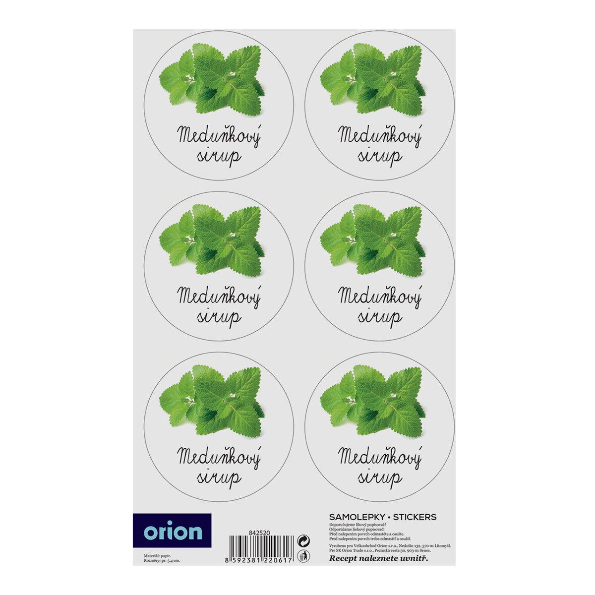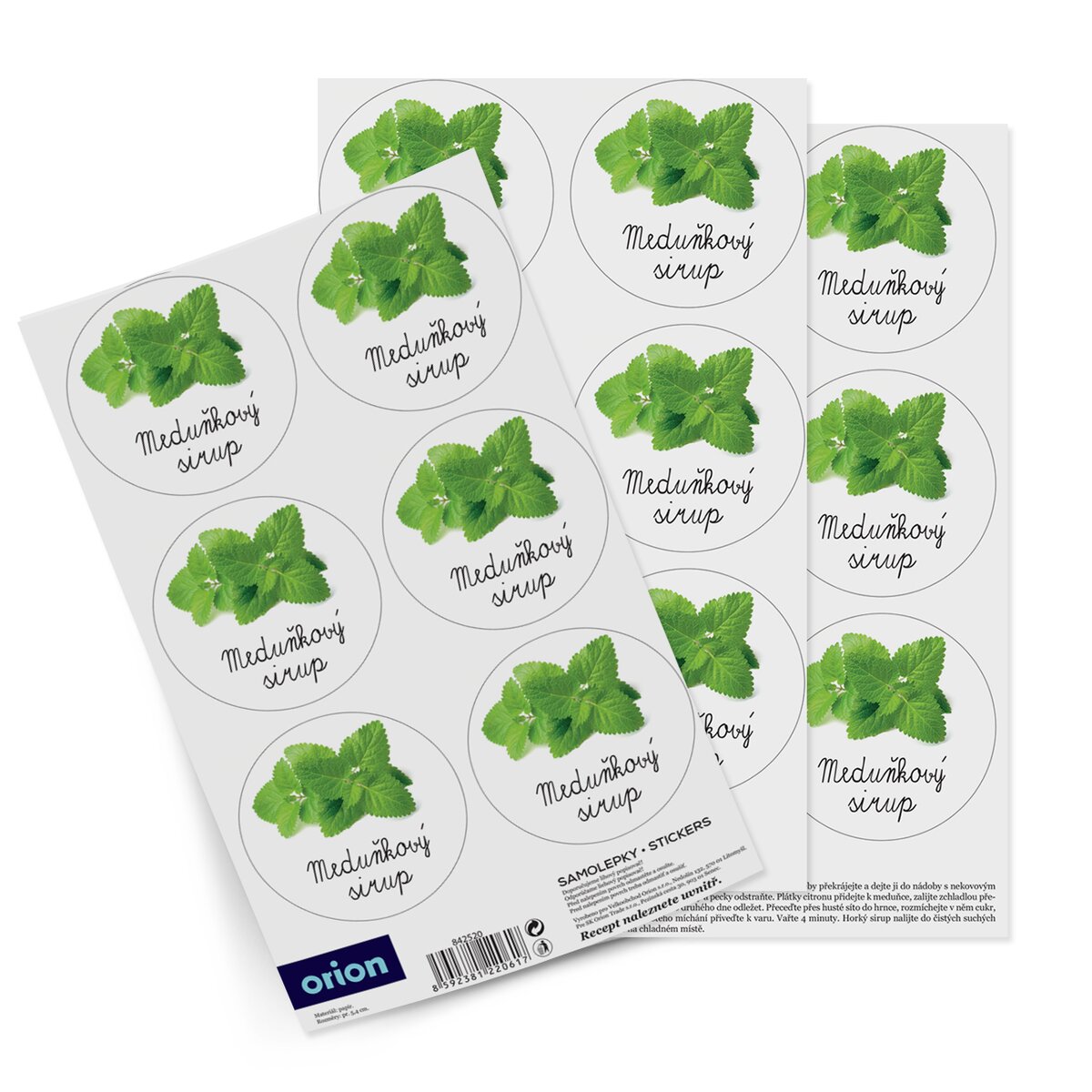 Kód produktu 842520Sada 18 kusů papírových samolepek s obrázkem a popisem MEDUŇKOVÝ SIRUP. Průměr jedné kulaté samolepky je 5,4 cm.