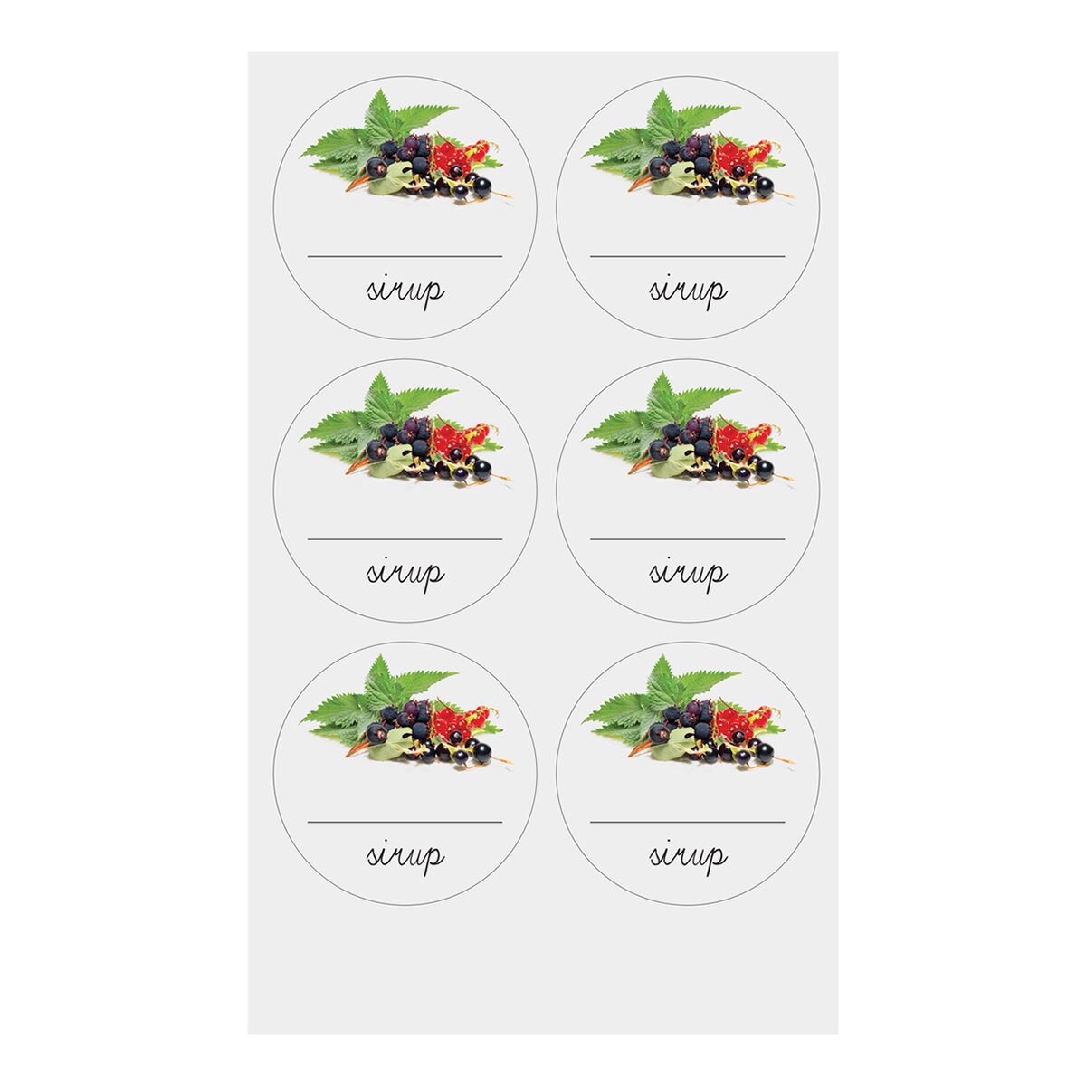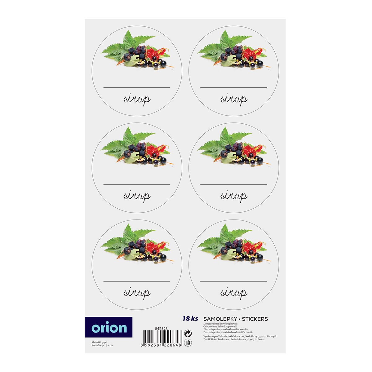 Kód produktu 842523Sada 18 kusů univerzálních papírových samolepek je doplněna obrázkem a prostorem pro označení druhu sirupu nebo roku jeho výroby. Průměr jedné kulaté samolepky je 5,4 cm.